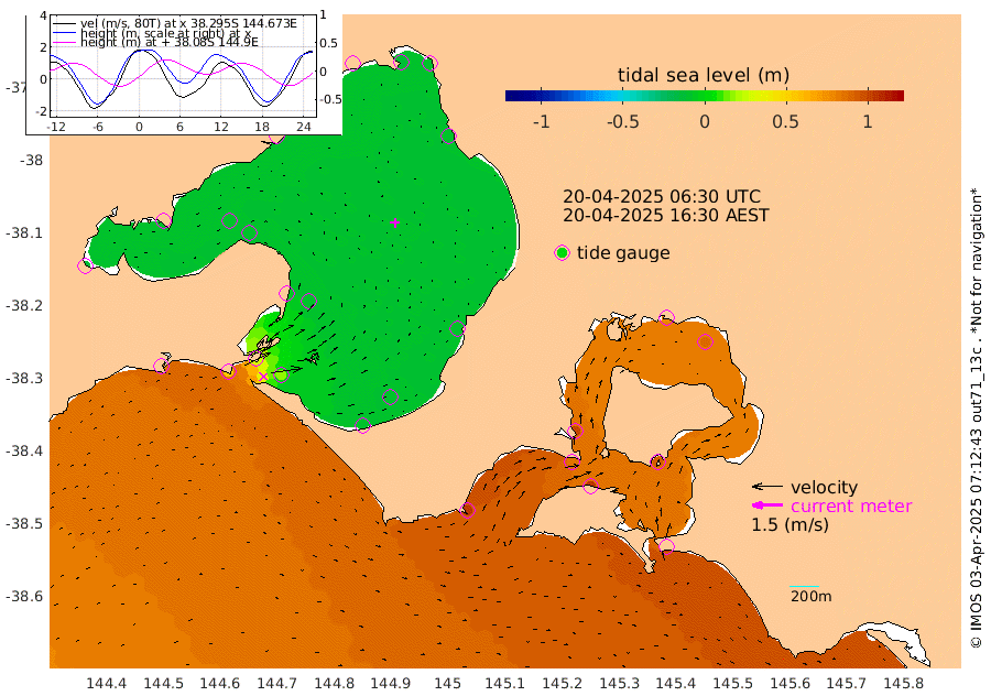 103cm San Remo 92cm Elizabeth Island 89cm Bouchier Channel 76cm Tooradin 102cm Cowes Jetty 99cm Western Port (Stony Point) 83cm Western Port (Sandy Point) 104cm Flinders Jetty -11cm Mornington -10cm Sandringham -11cm Rosebud Jetty -10cm Hovell Pile 17cm South Channel 56cm Point Lonsdale 26cm Queenscliff -9cm West Channel Pile 77cm Barwon Heads -7cm St Leonards -11cm Point Richards (Corio Bay) -9cm Point Richards Channel -14cm Geelong -14cm Werribee -9cm Altona -10cm Wilson Spit -12cm Melbourne (Williamstown) -11cm St Kilda