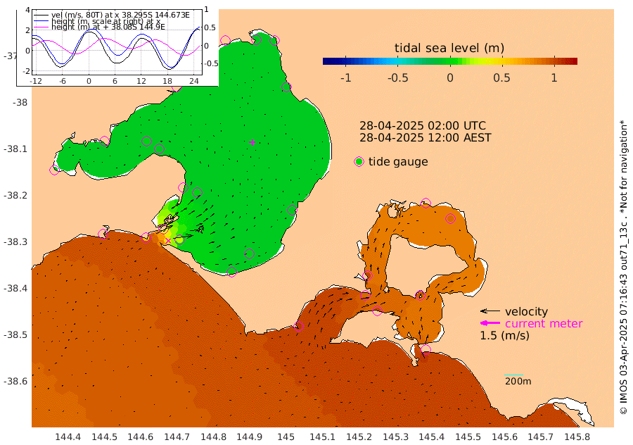 106cm San Remo 93cm Elizabeth Island 89cm Bouchier Channel 74cm Tooradin 99cm Cowes Jetty 99cm Western Port (Stony Point) 86cm Western Port (Sandy Point) 103cm Flinders Jetty -6cm Mornington -5cm Sandringham -3cm Rosebud Jetty -4cm Hovell Pile 23cm South Channel 60cm Point Lonsdale 32cm Queenscliff -3cm West Channel Pile 78cm Barwon Heads -3cm St Leonards -4cm Point Richards (Corio Bay) -4cm Point Richards Channel -7cm Geelong -8cm Werribee -4cm Altona -5cm Wilson Spit -5cm Melbourne (Williamstown) -5cm St Kilda