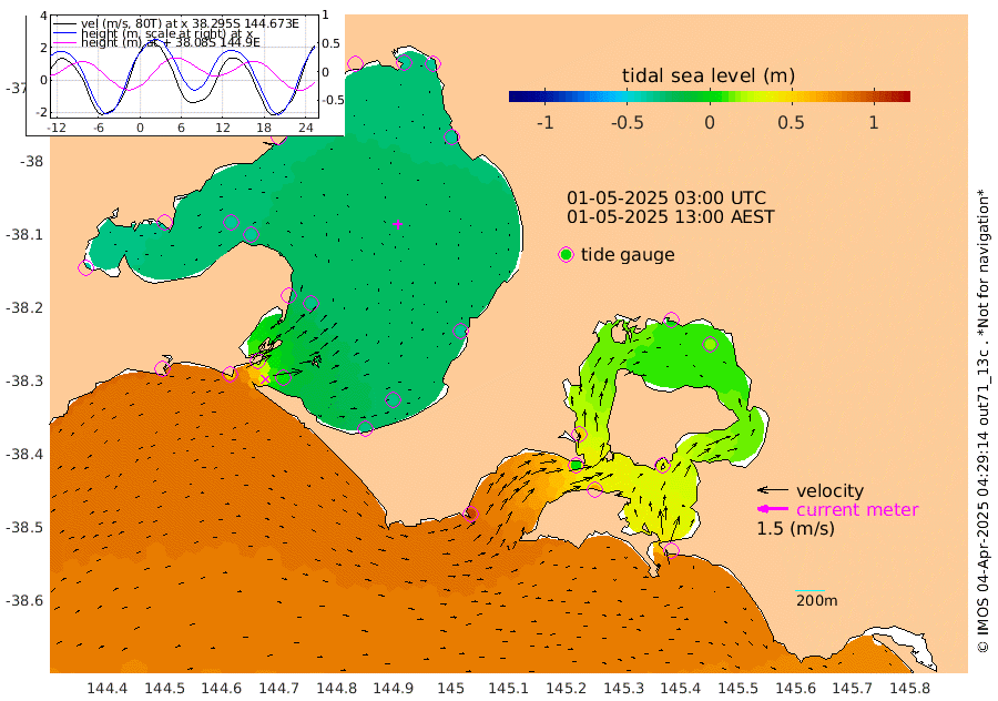 58cm San Remo 33cm Elizabeth Island 16cm Bouchier Channel -3cm Tooradin 65cm Cowes Jetty 55cm Western Port (Stony Point) 4cm Western Port (Sandy Point) 100cm Flinders Jetty -34cm Mornington -36cm Sandringham -33cm Rosebud Jetty -32cm Hovell Pile 6cm South Channel 56cm Point Lonsdale 19cm Queenscliff -31cm West Channel Pile 83cm Barwon Heads -31cm St Leonards -37cm Point Richards (Corio Bay) -34cm Point Richards Channel -41cm Geelong -32cm Werribee -35cm Altona -38cm Wilson Spit -36cm Melbourne (Williamstown) -37cm St Kilda