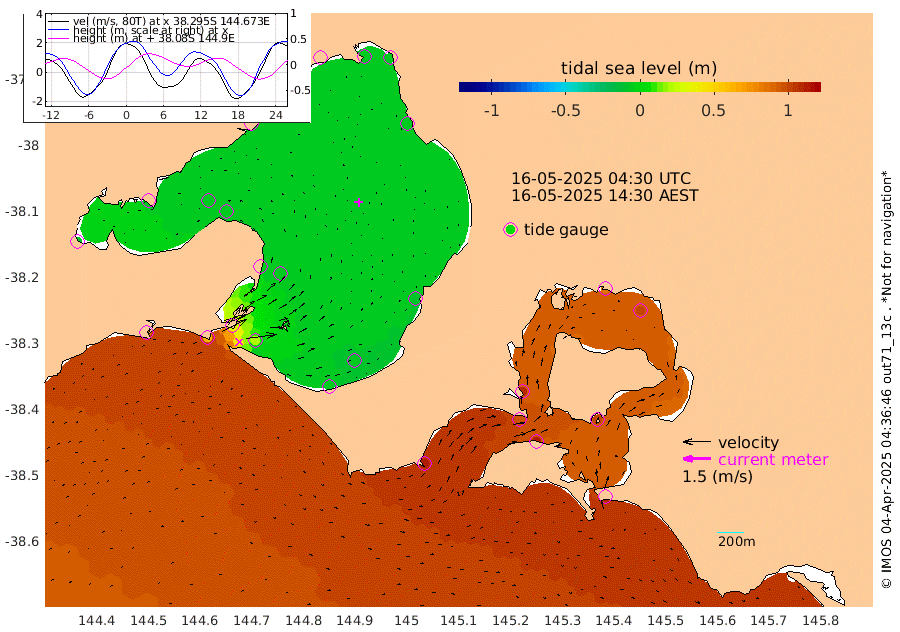 113cm San Remo 98cm Elizabeth Island 99cm Bouchier Channel 86cm Tooradin 109cm Cowes Jetty 106cm Western Port (Stony Point) 94cm Western Port (Sandy Point) 109cm Flinders Jetty -8cm Mornington -6cm Sandringham -7cm Rosebud Jetty -6cm Hovell Pile 22cm South Channel 63cm Point Lonsdale 32cm Queenscliff -4cm West Channel Pile 84cm Barwon Heads -3cm St Leonards -6cm Point Richards (Corio Bay) -4cm Point Richards Channel -8cm Geelong -10cm Werribee -5cm Altona -6cm Wilson Spit -7cm Melbourne (Williamstown) -6cm St Kilda