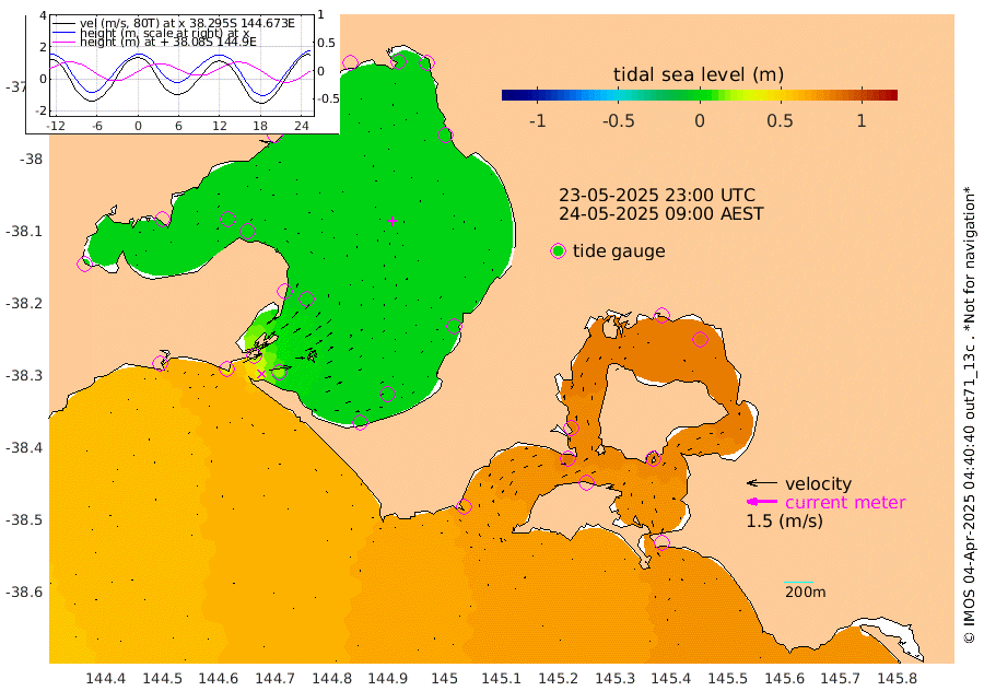 86cm San Remo 82cm Elizabeth Island 83cm Bouchier Channel 77cm Tooradin 75cm Cowes Jetty 80cm Western Port (Stony Point) 85cm Western Port (Sandy Point) 67cm Flinders Jetty 0cm Mornington 3cm Sandringham 3cm Rosebud Jetty 2cm Hovell Pile 17cm South Channel 36cm Point Lonsdale 21cm Queenscliff 3cm West Channel Pile 46cm Barwon Heads 3cm St Leonards 3cm Point Richards (Corio Bay) 3cm Point Richards Channel 2cm Geelong -2cm Werribee 3cm Altona 2cm Wilson Spit 2cm Melbourne (Williamstown) 2cm St Kilda