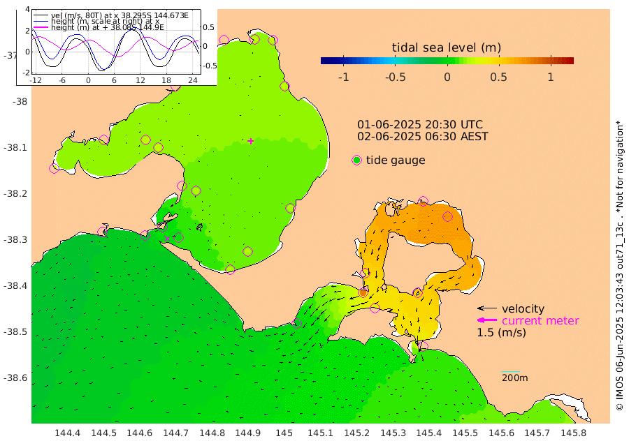42cm San Remo 55cm Elizabeth Island 75cm Bouchier Channel 84cm Tooradin 32cm Cowes Jetty 40cm Western Port (Stony Point) 80cm Western Port (Sandy Point) -8cm Flinders Jetty 22cm Mornington 24cm Sandringham 21cm Rosebud Jetty 20cm Hovell Pile 7cm South Channel -9cm Point Lonsdale 1cm Queenscliff 21cm West Channel Pile -16cm Barwon Heads 22cm St Leonards 25cm Point Richards (Corio Bay) 25cm Point Richards Channel 28cm Geelong 21cm Werribee 24cm Altona 26cm Wilson Spit 24cm Melbourne (Williamstown) 25cm St Kilda