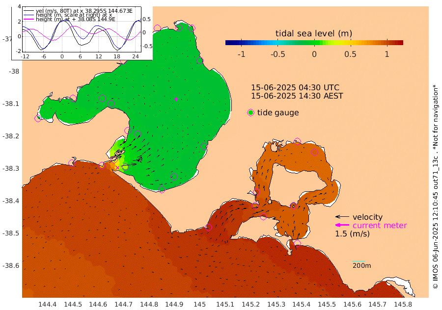 108cm San Remo 95cm Elizabeth Island 92cm Bouchier Channel 78cm Tooradin 106cm Cowes Jetty 103cm Western Port (Stony Point) 88cm Western Port (Sandy Point) 109cm Flinders Jetty -10cm Mornington -10cm Sandringham -10cm Rosebud Jetty -9cm Hovell Pile 20cm South Channel 63cm Point Lonsdale 30cm Queenscliff -8cm West Channel Pile 87cm Barwon Heads -6cm St Leonards -10cm Point Richards (Corio Bay) -7cm Point Richards Channel -13cm Geelong -14cm Werribee -9cm Altona -9cm Wilson Spit -11cm Melbourne (Williamstown) -10cm St Kilda