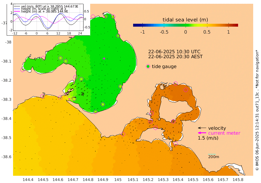88cm San Remo 87cm Elizabeth Island 88cm Bouchier Channel 78cm Tooradin 80cm Cowes Jetty 86cm Western Port (Stony Point) 87cm Western Port (Sandy Point) 70cm Flinders Jetty 15cm Mornington 15cm Sandringham 16cm Rosebud Jetty 15cm Hovell Pile 25cm South Channel 39cm Point Lonsdale 29cm Queenscliff 16cm West Channel Pile 47cm Barwon Heads 16cm St Leonards 16cm Point Richards (Corio Bay) 17cm Point Richards Channel 15cm Geelong 13cm Werribee 15cm Altona 18cm Wilson Spit 15cm Melbourne (Williamstown) 16cm St Kilda