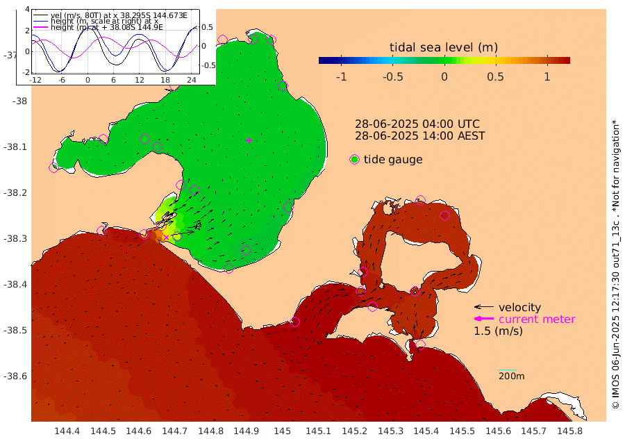 121cm San Remo 105cm Elizabeth Island 111cm Bouchier Channel 95cm Tooradin 119cm Cowes Jetty 117cm Western Port (Stony Point) 101cm Western Port (Sandy Point) 118cm Flinders Jetty -7cm Mornington -7cm Sandringham -7cm Rosebud Jetty -5cm Hovell Pile 24cm South Channel 69cm Point Lonsdale 35cm Queenscliff -4cm West Channel Pile 94cm Barwon Heads -3cm St Leonards -5cm Point Richards (Corio Bay) -3cm Point Richards Channel -8cm Geelong -6cm Werribee -5cm Altona -5cm Wilson Spit -6cm Melbourne (Williamstown) -6cm St Kilda
