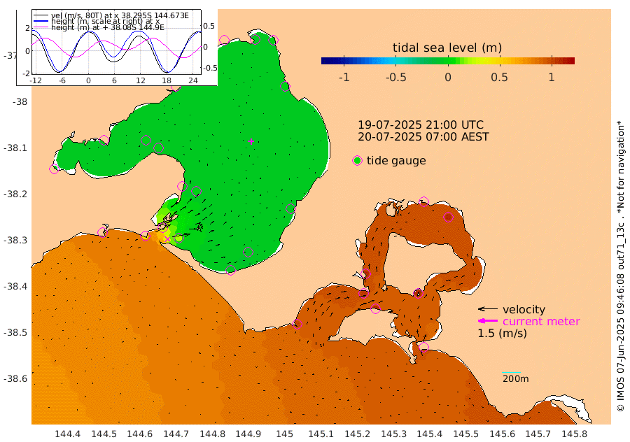 111cm San Remo 105cm Elizabeth Island 108cm Bouchier Channel 99cm Tooradin 107cm Cowes Jetty 108cm Western Port (Stony Point) 103cm Western Port (Sandy Point) 98cm Flinders Jetty -5cm Mornington -3cm Sandringham -4cm Rosebud Jetty -4cm Hovell Pile 19cm South Channel 50cm Point Lonsdale 26cm Queenscliff -3cm West Channel Pile 65cm Barwon Heads -2cm St Leonards -3cm Point Richards (Corio Bay) -2cm Point Richards Channel -5cm Geelong -6cm Werribee -2cm Altona -3cm Wilson Spit -4cm Melbourne (Williamstown) -3cm St Kilda