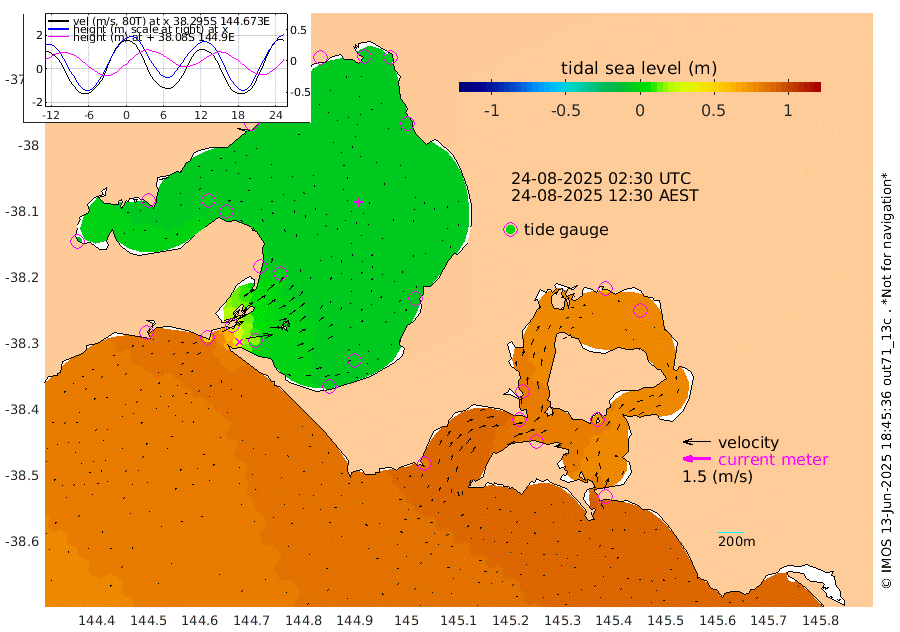 85cm San Remo 71cm Elizabeth Island 76cm Bouchier Channel 63cm Tooradin 79cm Cowes Jetty 82cm Western Port (Stony Point) 70cm Western Port (Sandy Point) 81cm Flinders Jetty -5cm Mornington -6cm Sandringham -5cm Rosebud Jetty -4cm Hovell Pile 17cm South Channel 49cm Point Lonsdale 25cm Queenscliff -3cm West Channel Pile 67cm Barwon Heads -2cm St Leonards -4cm Point Richards (Corio Bay) -2cm Point Richards Channel -6cm Geelong -5cm Werribee -4cm Altona -3cm Wilson Spit -5cm Melbourne (Williamstown) -4cm St Kilda
