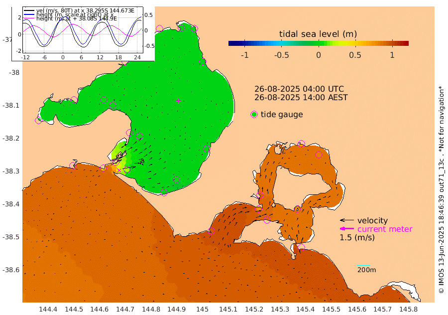 93cm San Remo 78cm Elizabeth Island 80cm Bouchier Channel 66cm Tooradin 89cm Cowes Jetty 91cm Western Port (Stony Point) 74cm Western Port (Sandy Point) 92cm Flinders Jetty 0cm Mornington -1cm Sandringham 0cm Rosebud Jetty 0cm Hovell Pile 22cm South Channel 56cm Point Lonsdale 32cm Queenscliff 1cm West Channel Pile 73cm Barwon Heads 2cm St Leonards 0cm Point Richards (Corio Bay) 2cm Point Richards Channel -3cm Geelong -1cm Werribee 0cm Altona 1cm Wilson Spit -1cm Melbourne (Williamstown) 0cm St Kilda