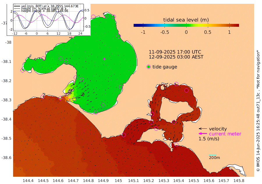 132cm San Remo 119cm Elizabeth Island 119cm Bouchier Channel 103cm Tooradin 126cm Cowes Jetty 124cm Western Port (Stony Point) 114cm Western Port (Sandy Point) 121cm Flinders Jetty 0cm Mornington 2cm Sandringham 2cm Rosebud Jetty 1cm Hovell Pile 29cm South Channel 69cm Point Lonsdale 39cm Queenscliff 3cm West Channel Pile 86cm Barwon Heads 4cm St Leonards 2cm Point Richards (Corio Bay) 3cm Point Richards Channel 0cm Geelong -2cm Werribee 3cm Altona 1cm Wilson Spit 1cm Melbourne (Williamstown) 2cm St Kilda