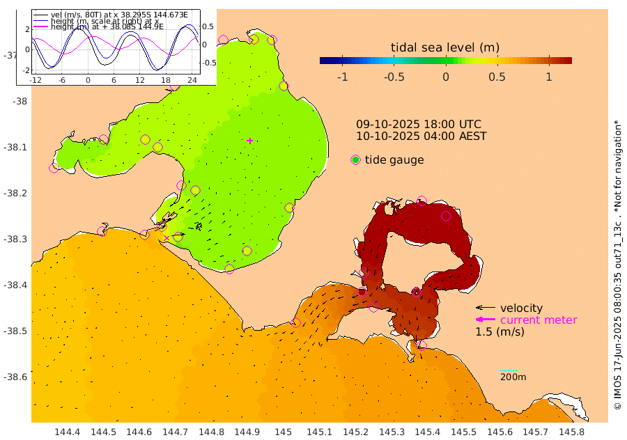 110cm San Remo 115cm Elizabeth Island 137cm Bouchier Channel 137cm Tooradin 101cm Cowes Jetty 104cm Western Port (Stony Point) 139cm Western Port (Sandy Point) 61cm Flinders Jetty 27cm Mornington 30cm Sandringham 26cm Rosebud Jetty 27cm Hovell Pile 29cm South Channel 36cm Point Lonsdale 29cm Queenscliff 28cm West Channel Pile 36cm Barwon Heads 28cm St Leonards 32cm Point Richards (Corio Bay) 31cm Point Richards Channel 34cm Geelong 24cm Werribee 31cm Altona 32cm Wilson Spit 30cm Melbourne (Williamstown) 31cm St Kilda