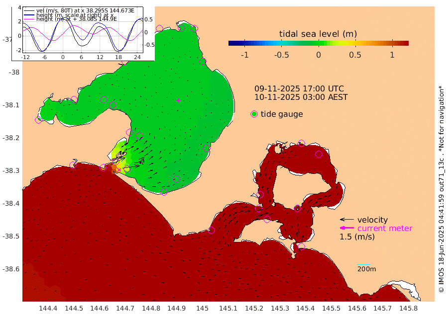 144cm San Remo 129cm Elizabeth Island 133cm Bouchier Channel 117cm Tooradin 143cm Cowes Jetty 139cm Western Port (Stony Point) 123cm Western Port (Sandy Point) 138cm Flinders Jetty -6cm Mornington -5cm Sandringham -6cm Rosebud Jetty -4cm Hovell Pile 29cm South Channel 78cm Point Lonsdale 40cm Queenscliff -3cm West Channel Pile 104cm Barwon Heads -1cm St Leonards -4cm Point Richards (Corio Bay) -2cm Point Richards Channel -7cm Geelong -6cm Werribee -4cm Altona -4cm Wilson Spit -6cm Melbourne (Williamstown) -5cm St Kilda
