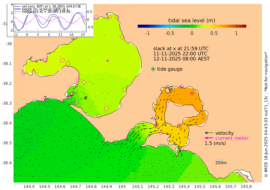 39cm San Remo 56cm Elizabeth Island 83cm Bouchier Channel 89cm Tooradin 32cm Cowes Jetty 42cm Western Port (Stony Point) 85cm Western Port (Sandy Point) -8cm Flinders Jetty 32cm Mornington 34cm Sandringham 30cm Rosebud Jetty 30cm Hovell Pile 15cm South Channel -2cm Point Lonsdale 8cm Queenscliff 31cm West Channel Pile -11cm Barwon Heads 31cm St Leonards 36cm Point Richards (Corio Bay) 35cm Point Richards Channel 39cm Geelong 28cm Werribee 34cm Altona 37cm Wilson Spit 34cm Melbourne (Williamstown) 35cm St Kilda