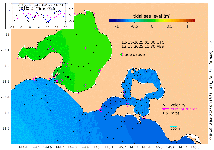 -83cm San Remo -74cm Elizabeth Island -75cm Bouchier Channel -70cm Tooradin -79cm Cowes Jetty -80cm Western Port (Stony Point) -73cm Western Port (Sandy Point) -73cm Flinders Jetty 7cm Mornington 7cm Sandringham 7cm Rosebud Jetty 6cm Hovell Pile -11cm South Channel -37cm Point Lonsdale -17cm Queenscliff 6cm West Channel Pile -55cm Barwon Heads 4cm St Leonards 6cm Point Richards (Corio Bay) 5cm Point Richards Channel 8cm Geelong 5cm Werribee 6cm Altona 5cm Wilson Spit 7cm Melbourne (Williamstown) 6cm St Kilda