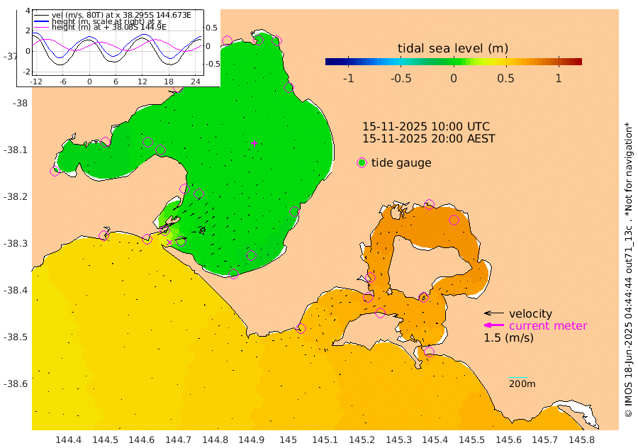 68cm San Remo 66cm Elizabeth Island 72cm Bouchier Channel 70cm Tooradin 63cm Cowes Jetty 68cm Western Port (Stony Point) 70cm Western Port (Sandy Point) 52cm Flinders Jetty 2cm Mornington 4cm Sandringham 3cm Rosebud Jetty 4cm Hovell Pile 14cm South Channel 27cm Point Lonsdale 17cm Queenscliff 4cm West Channel Pile 35cm Barwon Heads 4cm St Leonards 5cm Point Richards (Corio Bay) 4cm Point Richards Channel 4cm Geelong 4cm Werribee 4cm Altona 4cm Wilson Spit 4cm Melbourne (Williamstown) 4cm St Kilda