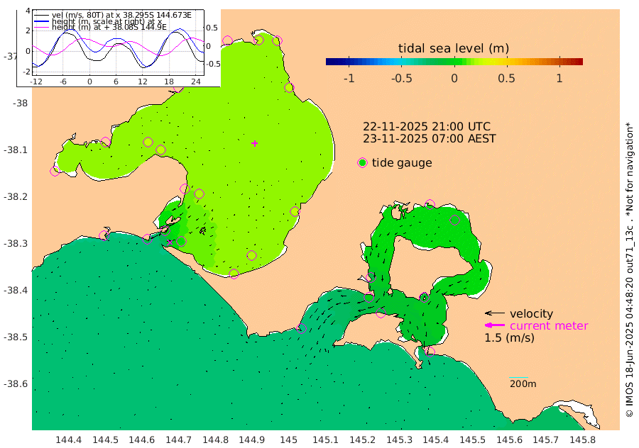 -24cm San Remo -10cm Elizabeth Island -4cm Bouchier Channel 4cm Tooradin -22cm Cowes Jetty -17cm Western Port (Stony Point) -1cm Western Port (Sandy Point) -33cm Flinders Jetty 23cm Mornington 23cm Sandringham 22cm Rosebud Jetty 22cm Hovell Pile 6cm South Channel -14cm Point Lonsdale 1cm Queenscliff 21cm West Channel Pile -29cm Barwon Heads 21cm St Leonards 24cm Point Richards (Corio Bay) 23cm Point Richards Channel 26cm Geelong 24cm Werribee 22cm Altona 24cm Wilson Spit 23cm Melbourne (Williamstown) 24cm St Kilda
