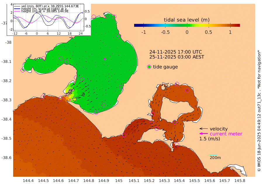 114cm San Remo 101cm Elizabeth Island 104cm Bouchier Channel 91cm Tooradin 110cm Cowes Jetty 109cm Western Port (Stony Point) 99cm Western Port (Sandy Point) 108cm Flinders Jetty -5cm Mornington -4cm Sandringham -4cm Rosebud Jetty -3cm Hovell Pile 23cm South Channel 63cm Point Lonsdale 32cm Queenscliff -2cm West Channel Pile 84cm Barwon Heads -1cm St Leonards -3cm Point Richards (Corio Bay) -2cm Point Richards Channel -6cm Geelong -8cm Werribee -2cm Altona -3cm Wilson Spit -5cm Melbourne (Williamstown) -4cm St Kilda