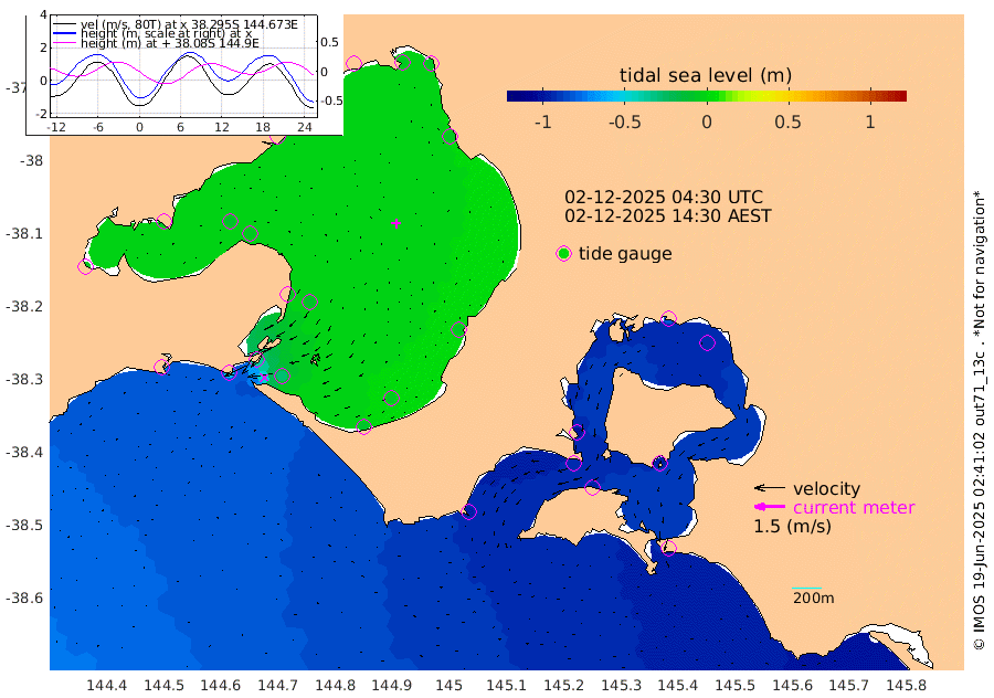 -104cm San Remo -97cm Elizabeth Island -90cm Bouchier Channel -80cm Tooradin -95cm Cowes Jetty -100cm Western Port (Stony Point) -93cm Western Port (Sandy Point) -95cm Flinders Jetty -6cm Mornington -5cm Sandringham -8cm Rosebud Jetty -7cm Hovell Pile -27cm South Channel -55cm Point Lonsdale -35cm Queenscliff -8cm West Channel Pile -69cm Barwon Heads -9cm St Leonards -7cm Point Richards (Corio Bay) -8cm Point Richards Channel -5cm Geelong -3cm Werribee -6cm Altona -8cm Wilson Spit -6cm Melbourne (Williamstown) -7cm St Kilda