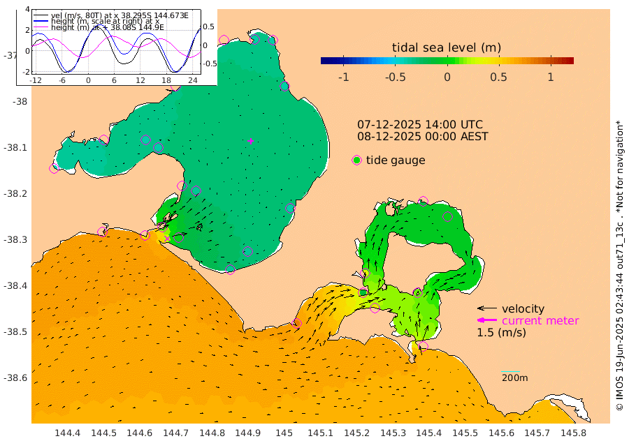 37cm San Remo 14cm Elizabeth Island -3cm Bouchier Channel -19cm Tooradin 44cm Cowes Jetty 35cm Western Port (Stony Point) -13cm Western Port (Sandy Point) 80cm Flinders Jetty -38cm Mornington -41cm Sandringham -37cm Rosebud Jetty -36cm Hovell Pile -2cm South Channel 43cm Point Lonsdale 10cm Queenscliff -35cm West Channel Pile 70cm Barwon Heads -35cm St Leonards -41cm Point Richards (Corio Bay) -39cm Point Richards Channel -45cm Geelong -35cm Werribee -39cm Altona -42cm Wilson Spit -40cm Melbourne (Williamstown) -41cm St Kilda