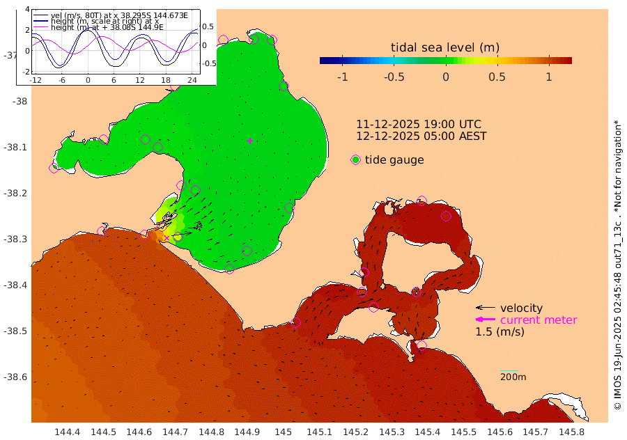 117cm San Remo 106cm Elizabeth Island 112cm Bouchier Channel 99cm Tooradin 114cm Cowes Jetty 117cm Western Port (Stony Point) 103cm Western Port (Sandy Point) 109cm Flinders Jetty 3cm Mornington 3cm Sandringham 2cm Rosebud Jetty 3cm Hovell Pile 27cm South Channel 63cm Point Lonsdale 36cm Queenscliff 4cm West Channel Pile 84cm Barwon Heads 7cm St Leonards 4cm Point Richards (Corio Bay) 6cm Point Richards Channel 2cm Geelong 3cm Werribee 4cm Altona 6cm Wilson Spit 2cm Melbourne (Williamstown) 4cm St Kilda