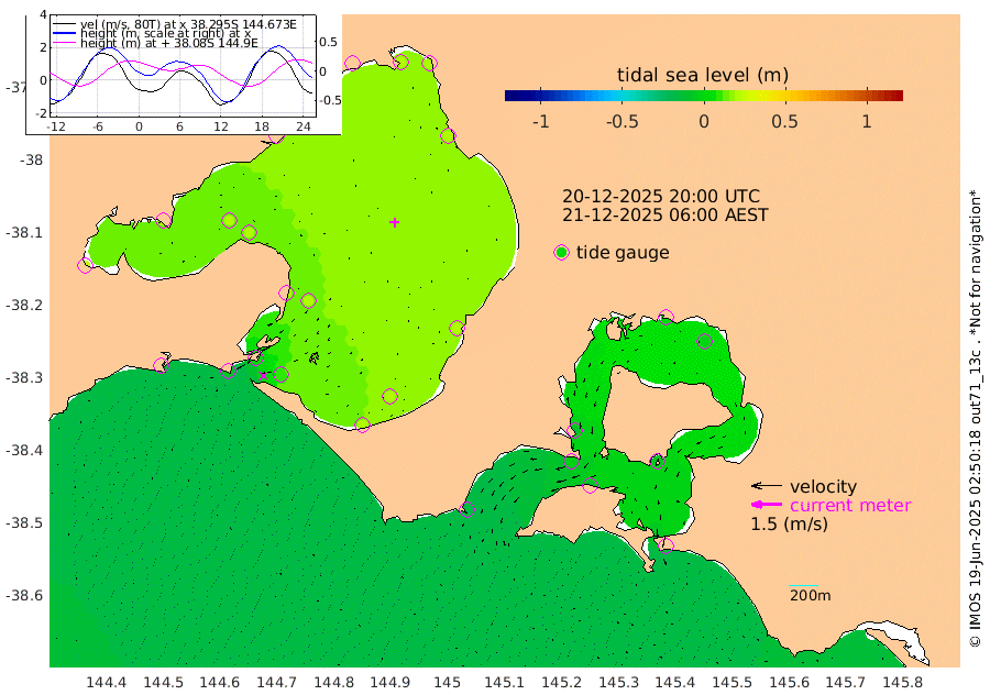 -14cm San Remo -5cm Elizabeth Island -1cm Bouchier Channel 3cm Tooradin -11cm Cowes Jetty -8cm Western Port (Stony Point) -1cm Western Port (Sandy Point) -18cm Flinders Jetty 22cm Mornington 21cm Sandringham 21cm Rosebud Jetty 20cm Hovell Pile 9cm South Channel -4cm Point Lonsdale 6cm Queenscliff 20cm West Channel Pile -16cm Barwon Heads 20cm St Leonards 22cm Point Richards (Corio Bay) 21cm Point Richards Channel 23cm Geelong 22cm Werribee 21cm Altona 23cm Wilson Spit 21cm Melbourne (Williamstown) 22cm St Kilda