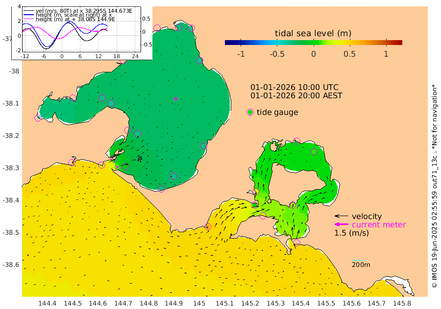 34cm San Remo 21cm Elizabeth Island 8cm Bouchier Channel -2cm Tooradin 39cm Cowes Jetty 34cm Western Port (Stony Point) -1cm Western Port (Sandy Point) 63cm Flinders Jetty -32cm Mornington -32cm Sandringham -31cm Rosebud Jetty -30cm Hovell Pile -4cm South Channel 29cm Point Lonsdale 5cm Queenscliff -30cm West Channel Pile 48cm Barwon Heads -29cm St Leonards -34cm Point Richards (Corio Bay) -32cm Point Richards Channel -37cm Geelong -30cm Werribee -32cm Altona -34cm Wilson Spit -33cm Melbourne (Williamstown) -34cm St Kilda