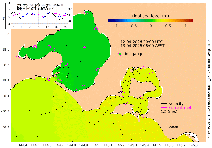 42cm San Remo 41cm Elizabeth Island 30cm Bouchier Channel 24cm Tooradin 40cm Cowes Jetty 39cm Western Port (Stony Point) 30cm Western Port (Sandy Point) 44cm Flinders Jetty -1cm Mornington 0cm Sandringham 2cm Rosebud Jetty 1cm Hovell Pile 12cm South Channel 23cm Point Lonsdale 16cm Queenscliff 1cm West Channel Pile 28cm Barwon Heads 1cm St Leonards 0cm Point Richards (Corio Bay) -1cm Point Richards Channel -2cm Geelong -1cm Werribee 0cm Altona -2cm Wilson Spit -1cm Melbourne (Williamstown) 0cm St Kilda