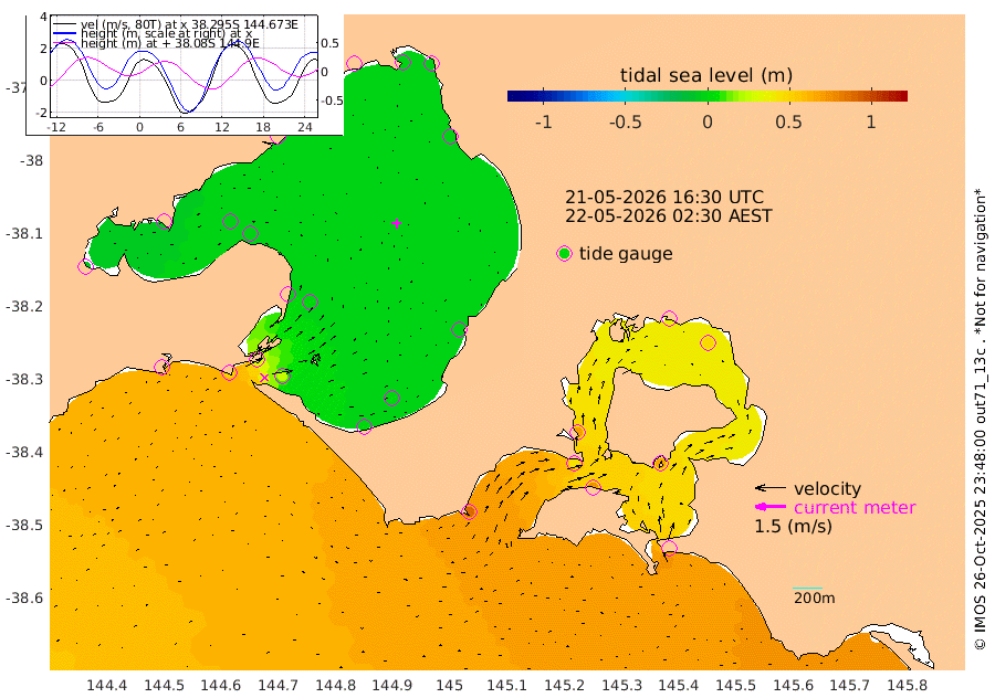 75cm San Remo 64cm Elizabeth Island 48cm Bouchier Channel 34cm Tooradin 74cm Cowes Jetty 70cm Western Port (Stony Point) 44cm Western Port (Sandy Point) 88cm Flinders Jetty -2cm Mornington -1cm Sandringham 2cm Rosebud Jetty 1cm Hovell Pile 23cm South Channel 50cm Point Lonsdale 32cm Queenscliff 1cm West Channel Pile 59cm Barwon Heads 0cm St Leonards -1cm Point Richards (Corio Bay) -2cm Point Richards Channel -5cm Geelong 0cm Werribee -1cm Altona -4cm Wilson Spit -2cm Melbourne (Williamstown) -1cm St Kilda