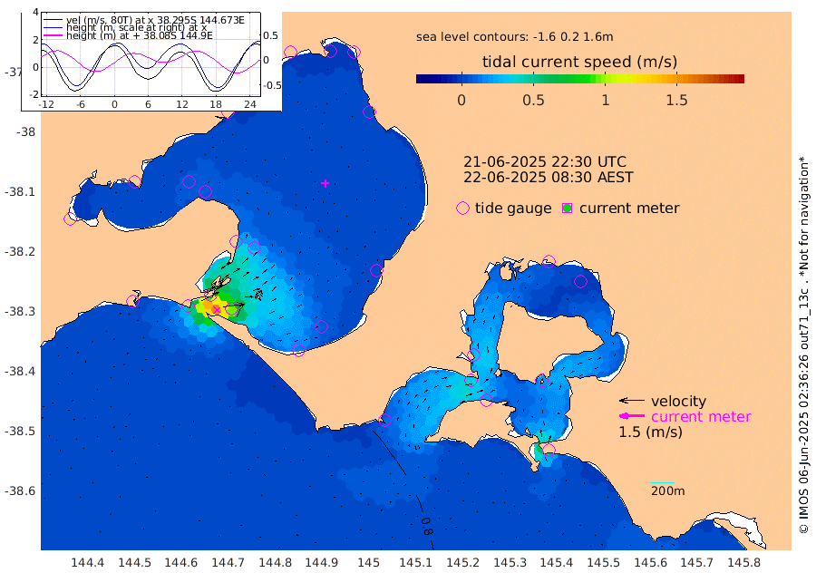99cm San Remo 94cm Elizabeth Island 96cm Bouchier Channel 89cm Tooradin 92cm Cowes Jetty 94cm Western Port (Stony Point) 95cm Western Port (Sandy Point) 83cm Flinders Jetty -4cm Mornington -2cm Sandringham -2cm Rosebud Jetty -2cm Hovell Pile 17cm South Channel 43cm Point Lonsdale 23cm Queenscliff -2cm West Channel Pile 57cm Barwon Heads -1cm St Leonards -2cm Point Richards (Corio Bay) -1cm Point Richards Channel -3cm Geelong -6cm Werribee -1cm Altona -2cm Wilson Spit -2cm Melbourne (Williamstown) -2cm St Kilda