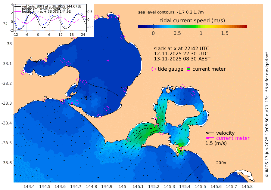 46cm San Remo 60cm Elizabeth Island 87cm Bouchier Channel 91cm Tooradin 38cm Cowes Jetty 48cm Western Port (Stony Point) 88cm Western Port (Sandy Point) 0cm Flinders Jetty 30cm Mornington 31cm Sandringham 27cm Rosebud Jetty 28cm Hovell Pile 15cm South Channel 2cm Point Lonsdale 9cm Queenscliff 28cm West Channel Pile -5cm Barwon Heads 29cm St Leonards 33cm Point Richards (Corio Bay) 33cm Point Richards Channel 36cm Geelong 26cm Werribee 32cm Altona 35cm Wilson Spit 32cm Melbourne (Williamstown) 33cm St Kilda