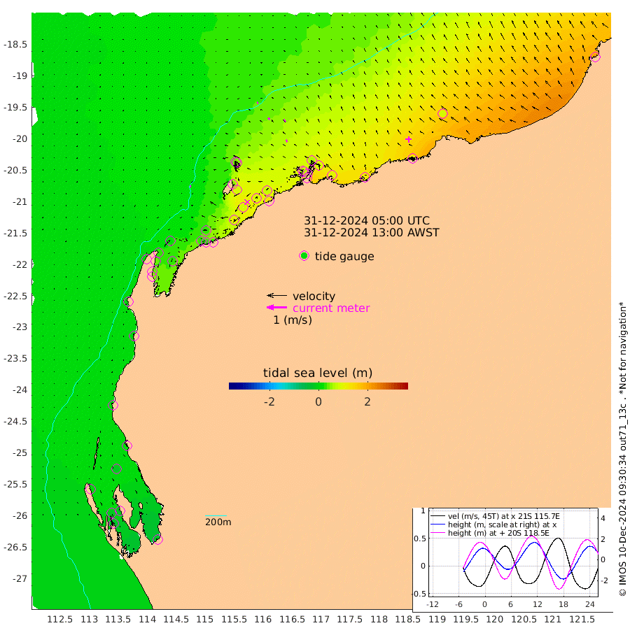 6cm/s -93T +12cm/s rms + 5cm/s -173T. NWSBAR 206m 0cm/s -115T +22cm/s rms + 10cm/s -148T. TAN100 109m 6cm/s -72T +11cm/s rms + 8cm/s -129T. PIL200 208m 11cm/s -47T +13cm/s rms + 7cm/s -137T. PIL100 105m 12cm/s -37T +12cm/s rms + 2cm/s -92T. PIL050 55m 1cm/s -16T +18cm/s rms + 4cm/s -149T. NRSNIN 61m 15cm/s -36T +6cm/s rms + 3cm/s 112T. NW Shelf M6 65m 1cm Withnell Point -12cm Denham -16cm Shark Bay (Inr Bn) -17cm Shark Bay -28cm Useless Loop -20cm Hamelin Pool 15cm Carnarvon 6cm Cape Cuvier 6cm Coral Bay 9cm Norwegian Bay 43cm Badjirrajirra 11cm Tantabiddi 27cm Point Murat 35cm Exmouth 50cm Learmonth 28cm Y Island 18cm North Muiron Island 23cm Roller 28cm Ashburton North 32cm Onslow (Beadon Creek) 28cm Thevenard Island 111cm Large Island 88cm North Sandy Island 50cm Barrow Island (Wapet Landing) 82cm Barrow Island (Tanker Mooring) 70cm Withnell Bay 51cm Trimouille Island 36cm North West Island 126cm Fortescue Road 69cm Steamboat Island 79cm Sholl Island 71cm Fairway Beacon 71cm Mawby Island 71cm Dampier (King Bay) 66cm Cape Legendre 89cm Hauy Island 96cm Port Walcott (Cape Lambert) 120cm Depuch Island 120cm Port Hedland 90cm Bedout Island 207cm Lagrange Bay