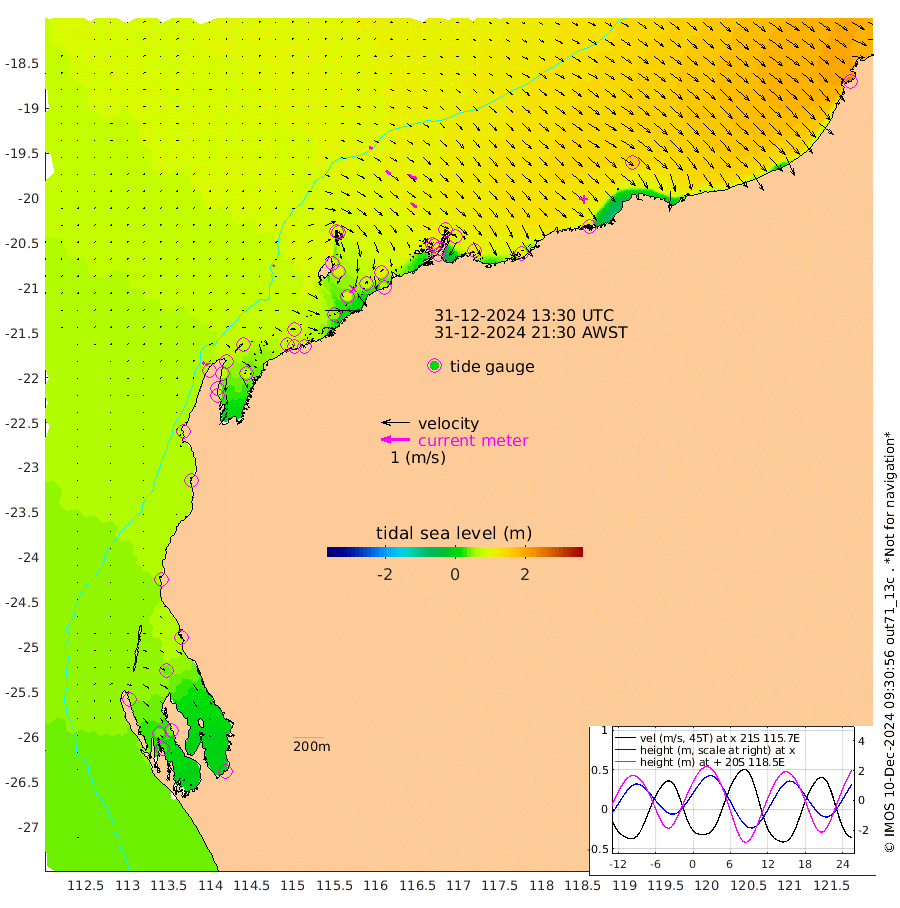 5cm/s 51T +12cm/s rms + 5cm/s -173T. NWSBAR 206m 8cm/s 40T +22cm/s rms + 10cm/s -148T. TAN100 109m 12cm/s 109T +11cm/s rms + 8cm/s -129T. PIL200 208m 21cm/s 123T +13cm/s rms + 7cm/s -137T. PIL100 105m 26cm/s 124T +12cm/s rms + 2cm/s -92T. PIL050 55m 8cm/s 44T +18cm/s rms + 4cm/s -149T. NRSNIN 61m 34cm/s 119T +6cm/s rms + 3cm/s 112T. NW Shelf M6 65m 47cm Withnell Point 38cm Denham 35cm Shark Bay (Inr Bn) 44cm Shark Bay 34cm Useless Loop -8cm Hamelin Pool 60cm Carnarvon 58cm Cape Cuvier 61cm Coral Bay 61cm Norwegian Bay 71cm Badjirrajirra 64cm Tantabiddi 66cm Point Murat 68cm Exmouth 63cm Learmonth 76cm Y Island 69cm North Muiron Island 77cm Roller 76cm Ashburton North 77cm Onslow (Beadon Creek) 79cm Thevenard Island 49cm Large Island 80cm North Sandy Island 85cm Barrow Island (Wapet Landing) 80cm Barrow Island (Tanker Mooring) 111cm Withnell Bay 75cm Trimouille Island 80cm North West Island 59cm Fortescue Road 111cm Steamboat Island 70cm Sholl Island 108cm Fairway Beacon 110cm Mawby Island 111cm Dampier (King Bay) 118cm Cape Legendre 103cm Hauy Island 120cm Port Walcott (Cape Lambert) 128cm Depuch Island 139cm Port Hedland 154cm Bedout Island 238cm Lagrange Bay