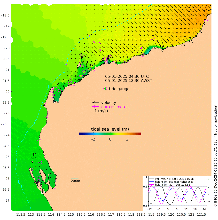 7cm/s 54T +12cm/s rms + 5cm/s -173T. NWSBAR 206m 9cm/s 41T +22cm/s rms + 10cm/s -148T. TAN100 109m 17cm/s 108T +11cm/s rms + 8cm/s -129T. PIL200 208m 27cm/s 123T +13cm/s rms + 7cm/s -137T. PIL100 105m 32cm/s 126T +12cm/s rms + 2cm/s -92T. PIL050 55m 9cm/s 48T +18cm/s rms + 4cm/s -149T. NRSNIN 61m 31cm/s 123T +6cm/s rms + 3cm/s 112T. NW Shelf M6 65m -7cm Withnell Point -28cm Denham -24cm Shark Bay (Inr Bn) -30cm Shark Bay -30cm Useless Loop -6cm Hamelin Pool 9cm Carnarvon 20cm Cape Cuvier 23cm Coral Bay 25cm Norwegian Bay 27cm Badjirrajirra 26cm Tantabiddi 24cm Point Murat 24cm Exmouth 32cm Learmonth 33cm Y Island 30cm North Muiron Island 34cm Roller 39cm Ashburton North 39cm Onslow (Beadon Creek) 39cm Thevenard Island 46cm Large Island 44cm North Sandy Island 48cm Barrow Island (Wapet Landing) 38cm Barrow Island (Tanker Mooring) 81cm Withnell Bay 55cm Trimouille Island 39cm North West Island 58cm Fortescue Road 72cm Steamboat Island 56cm Sholl Island 77cm Fairway Beacon 80cm Mawby Island 81cm Dampier (King Bay) 86cm Cape Legendre 74cm Hauy Island 93cm Port Walcott (Cape Lambert) 98cm Depuch Island 121cm Port Hedland 132cm Bedout Island 236cm Lagrange Bay