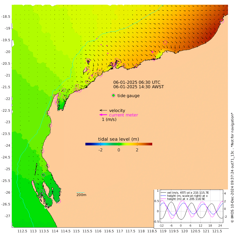 3cm/s 13T +12cm/s rms + 5cm/s -173T. NWSBAR 206m 6cm/s 40T +22cm/s rms + 10cm/s -148T. TAN100 109m 8cm/s 101T +11cm/s rms + 8cm/s -129T. PIL200 208m 12cm/s 112T +13cm/s rms + 7cm/s -137T. PIL100 105m 15cm/s 111T +12cm/s rms + 2cm/s -92T. PIL050 55m 6cm/s 45T +18cm/s rms + 4cm/s -149T. NRSNIN 61m 10cm/s 97T +6cm/s rms + 3cm/s 112T. NW Shelf M6 65m 17cm Withnell Point 0cm Denham 1cm Shark Bay (Inr Bn) -3cm Shark Bay -9cm Useless Loop -14cm Hamelin Pool 39cm Carnarvon 36cm Cape Cuvier 39cm Coral Bay 43cm Norwegian Bay 78cm Badjirrajirra 45cm Tantabiddi 59cm Point Murat 69cm Exmouth 79cm Learmonth 70cm Y Island 56cm North Muiron Island 63cm Roller 70cm Ashburton North 75cm Onslow (Beadon Creek) 72cm Thevenard Island 95cm Large Island 116cm North Sandy Island 96cm Barrow Island (Wapet Landing) 112cm Barrow Island (Tanker Mooring) 138cm Withnell Bay 101cm Trimouille Island 74cm North West Island 109cm Fortescue Road 133cm Steamboat Island 129cm Sholl Island 134cm Fairway Beacon 136cm Mawby Island 137cm Dampier (King Bay) 143cm Cape Legendre 142cm Hauy Island 166cm Port Walcott (Cape Lambert) 179cm Depuch Island 206cm Port Hedland 200cm Bedout Island 243cm Lagrange Bay