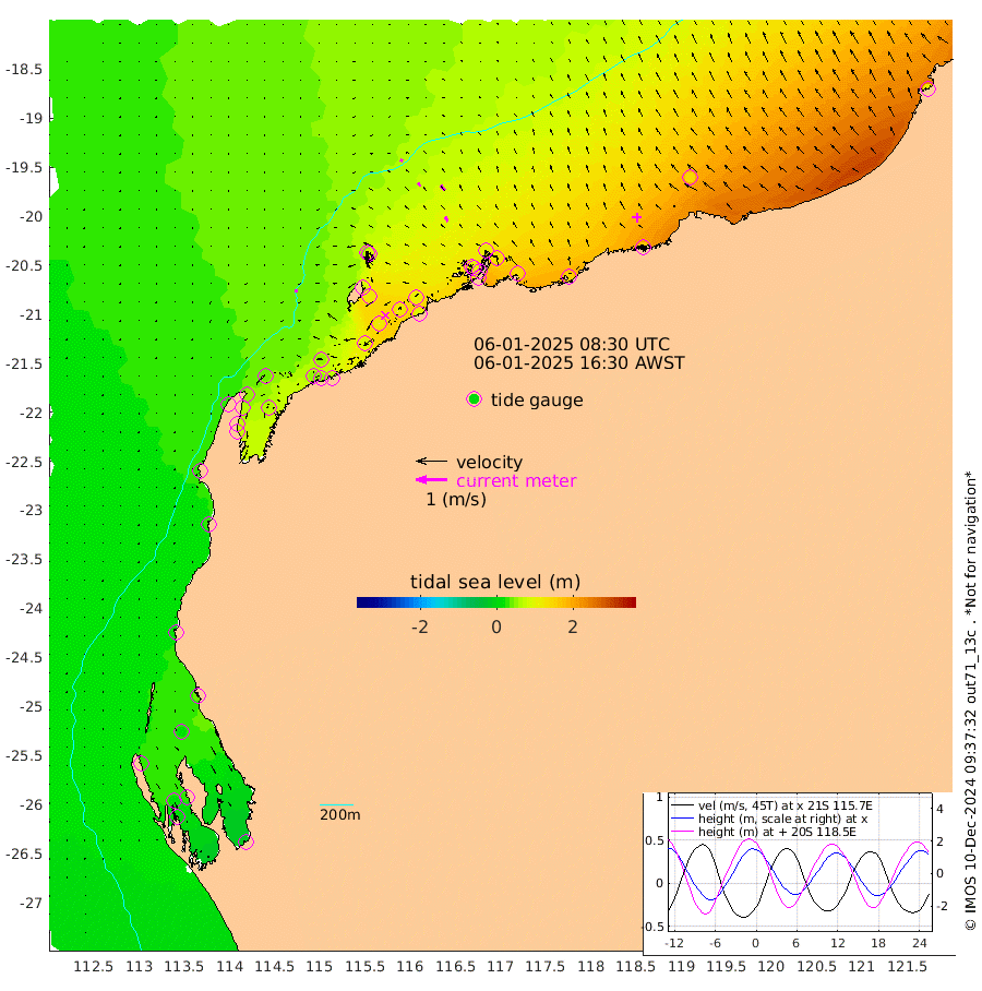 8cm/s -90T +12cm/s rms + 5cm/s -173T. NWSBAR 206m 3cm/s -136T +22cm/s rms + 10cm/s -148T. TAN100 109m 8cm/s -67T +11cm/s rms + 8cm/s -129T. PIL200 208m 14cm/s -40T +13cm/s rms + 7cm/s -137T. PIL100 105m 16cm/s -31T +12cm/s rms + 2cm/s -92T. PIL050 55m 2cm/s -120T +18cm/s rms + 4cm/s -149T. NRSNIN 61m 22cm/s -43T +6cm/s rms + 3cm/s 112T. NW Shelf M6 65m 25cm Withnell Point 23cm Denham 19cm Shark Bay (Inr Bn) 19cm Shark Bay 11cm Useless Loop -14cm Hamelin Pool 40cm Carnarvon 22cm Cape Cuvier 23cm Coral Bay 30cm Norwegian Bay 77cm Badjirrajirra 29cm Tantabiddi 54cm Point Murat 67cm Exmouth 74cm Learmonth 60cm Y Island 42cm North Muiron Island 48cm Roller 53cm Ashburton North 61cm Onslow (Beadon Creek) 55cm Thevenard Island 84cm Large Island 120cm North Sandy Island 83cm Barrow Island (Wapet Landing) 119cm Barrow Island (Tanker Mooring) 108cm Withnell Bay 86cm Trimouille Island 56cm North West Island 99cm Fortescue Road 108cm Steamboat Island 122cm Sholl Island 107cm Fairway Beacon 104cm Mawby Island 108cm Dampier (King Bay) 112cm Cape Legendre 125cm Hauy Island 138cm Port Walcott (Cape Lambert) 155cm Depuch Island 167cm Port Hedland 145cm Bedout Island 119cm Lagrange Bay