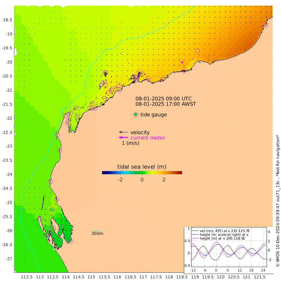 3cm/s -63T +12cm/s rms + 5cm/s -173T. NWSBAR 206m 2cm/s 40T +22cm/s rms + 10cm/s -148T. TAN100 109m 1cm/s 45T +11cm/s rms + 8cm/s -129T. PIL200 208m 4cm/s 59T +13cm/s rms + 7cm/s -137T. PIL100 105m 6cm/s 61T +12cm/s rms + 2cm/s -92T. PIL050 55m 2cm/s 38T +18cm/s rms + 4cm/s -149T. NRSNIN 61m 5cm/s 12T +6cm/s rms + 3cm/s 112T. NW Shelf M6 65m 38cm Withnell Point 32cm Denham 29cm Shark Bay (Inr Bn) 30cm Shark Bay 22cm Useless Loop -13cm Hamelin Pool 55cm Carnarvon 43cm Cape Cuvier 45cm Coral Bay 50cm Norwegian Bay 87cm Badjirrajirra 50cm Tantabiddi 67cm Point Murat 78cm Exmouth 83cm Learmonth 75cm Y Island 60cm North Muiron Island 66cm Roller 71cm Ashburton North 77cm Onslow (Beadon Creek) 73cm Thevenard Island 69cm Large Island 115cm North Sandy Island 95cm Barrow Island (Wapet Landing) 115cm Barrow Island (Tanker Mooring) 123cm Withnell Bay 94cm Trimouille Island 74cm North West Island 79cm Fortescue Road 122cm Steamboat Island 122cm Sholl Island 121cm Fairway Beacon 121cm Mawby Island 123cm Dampier (King Bay) 132cm Cape Legendre 129cm Hauy Island 147cm Port Walcott (Cape Lambert) 152cm Depuch Island 174cm Port Hedland 160cm Bedout Island 125cm Lagrange Bay
