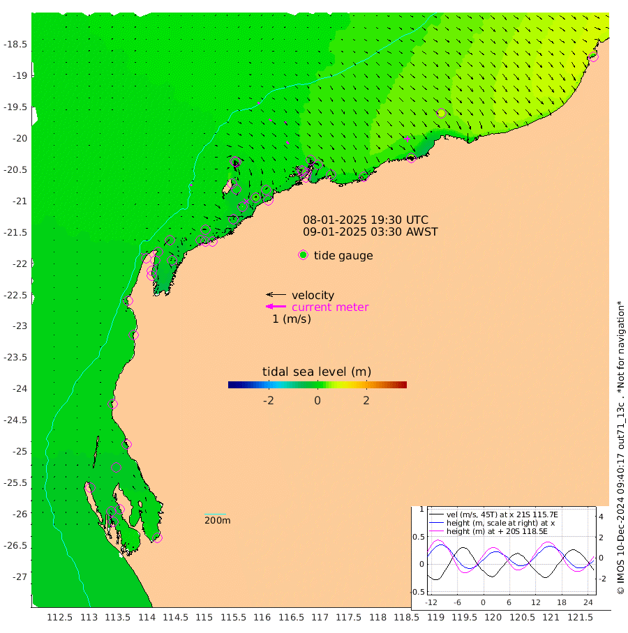8cm/s 55T +12cm/s rms + 5cm/s -173T. NWSBAR 206m 2cm/s 54T +22cm/s rms + 10cm/s -148T. TAN100 109m 10cm/s 107T +11cm/s rms + 8cm/s -129T. PIL200 208m 15cm/s 131T +13cm/s rms + 7cm/s -137T. PIL100 105m 16cm/s 135T +12cm/s rms + 2cm/s -92T. PIL050 55m 2cm/s 60T +18cm/s rms + 4cm/s -149T. NRSNIN 61m 8cm/s 136T +6cm/s rms + 3cm/s 112T. NW Shelf M6 65m -24cm Withnell Point -31cm Denham -28cm Shark Bay (Inr Bn) -27cm Shark Bay -27cm Useless Loop 4cm Hamelin Pool -18cm Carnarvon -8cm Cape Cuvier -6cm Coral Bay -6cm Norwegian Bay -2cm Badjirrajirra -4cm Tantabiddi -4cm Point Murat -4cm Exmouth -3cm Learmonth 2cm Y Island -2cm North Muiron Island 0cm Roller 3cm Ashburton North 2cm Onslow (Beadon Creek) 4cm Thevenard Island -10cm Large Island 4cm North Sandy Island 7cm Barrow Island (Wapet Landing) 1cm Barrow Island (Tanker Mooring) 25cm Withnell Bay 3cm Trimouille Island 4cm North West Island -3cm Fortescue Road 18cm Steamboat Island 33cm Sholl Island 23cm Fairway Beacon 25cm Mawby Island 25cm Dampier (King Bay) 20cm Cape Legendre 22cm Hauy Island 31cm Port Walcott (Cape Lambert) 17cm Depuch Island 46cm Port Hedland 68cm Bedout Island 25cm Lagrange Bay