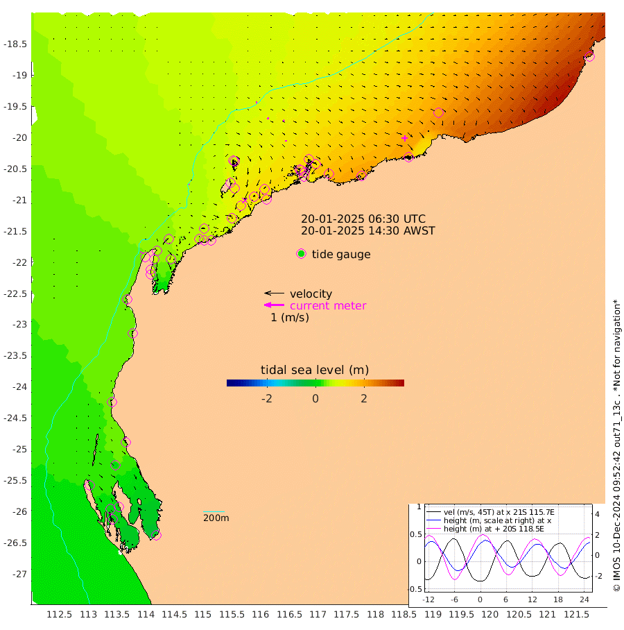2cm/s -41T +12cm/s rms + 5cm/s -173T. NWSBAR 206m 4cm/s 38T +22cm/s rms + 10cm/s -148T. TAN100 109m 4cm/s 94T +11cm/s rms + 8cm/s -129T. PIL200 208m 7cm/s 100T +13cm/s rms + 7cm/s -137T. PIL100 105m 9cm/s 96T +12cm/s rms + 2cm/s -92T. PIL050 55m 5cm/s 43T +18cm/s rms + 4cm/s -149T. NRSNIN 61m 8cm/s 65T +6cm/s rms + 3cm/s 112T. NW Shelf M6 65m 22cm Withnell Point 9cm Denham 7cm Shark Bay (Inr Bn) 5cm Shark Bay -3cm Useless Loop -16cm Hamelin Pool 43cm Carnarvon 36cm Cape Cuvier 39cm Coral Bay 43cm Norwegian Bay 81cm Badjirrajirra 45cm Tantabiddi 61cm Point Murat 72cm Exmouth 85cm Learmonth 72cm Y Island 57cm North Muiron Island 66cm Roller 71cm Ashburton North 76cm Onslow (Beadon Creek) 73cm Thevenard Island 119cm Large Island 128cm North Sandy Island 98cm Barrow Island (Wapet Landing) 119cm Barrow Island (Tanker Mooring) 137cm Withnell Bay 95cm Trimouille Island 77cm North West Island 137cm Fortescue Road 126cm Steamboat Island 131cm Sholl Island 134cm Fairway Beacon 137cm Mawby Island 137cm Dampier (King Bay) 136cm Cape Legendre 142cm Hauy Island 167cm Port Walcott (Cape Lambert) 183cm Depuch Island 206cm Port Hedland 191cm Bedout Island 276cm Lagrange Bay