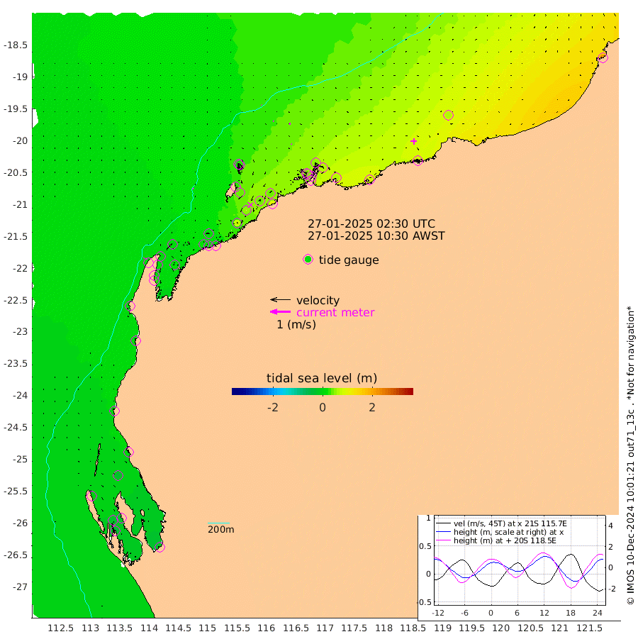 3cm/s -54T +12cm/s rms + 5cm/s -173T. NWSBAR 206m 3cm/s 47T +22cm/s rms + 10cm/s -148T. TAN100 109m 1cm/s 127T +11cm/s rms + 8cm/s -129T. PIL200 208m 2cm/s 111T +13cm/s rms + 7cm/s -137T. PIL100 105m 3cm/s 104T +12cm/s rms + 2cm/s -92T. PIL050 55m 4cm/s 41T +18cm/s rms + 4cm/s -149T. NRSNIN 61m 6cm/s 94T +6cm/s rms + 3cm/s 112T. NW Shelf M6 65m -9cm Withnell Point -26cm Denham -28cm Shark Bay (Inr Bn) -28cm Shark Bay -37cm Useless Loop -17cm Hamelin Pool 3cm Carnarvon 2cm Cape Cuvier 2cm Coral Bay 4cm Norwegian Bay 17cm Badjirrajirra 5cm Tantabiddi 10cm Point Murat 14cm Exmouth 24cm Learmonth 12cm Y Island 8cm North Muiron Island 13cm Roller 16cm Ashburton North 17cm Onslow (Beadon Creek) 16cm Thevenard Island 73cm Large Island 47cm North Sandy Island 28cm Barrow Island (Wapet Landing) 40cm Barrow Island (Tanker Mooring) 46cm Withnell Bay 26cm Trimouille Island 22cm North West Island 93cm Fortescue Road 39cm Steamboat Island 35cm Sholl Island 46cm Fairway Beacon 48cm Mawby Island 47cm Dampier (King Bay) 46cm Cape Legendre 57cm Hauy Island 62cm Port Walcott (Cape Lambert) 81cm Depuch Island 80cm Port Hedland 64cm Bedout Island 225cm Lagrange Bay