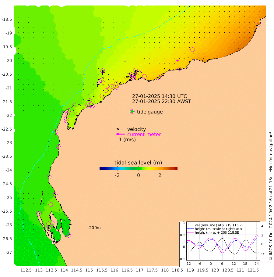 2cm/s -85T +12cm/s rms + 5cm/s -173T. NWSBAR 206m 1cm/s -124T +22cm/s rms + 10cm/s -148T. TAN100 109m 2cm/s -75T +11cm/s rms + 8cm/s -129T. PIL200 208m 4cm/s -27T +13cm/s rms + 7cm/s -137T. PIL100 105m 5cm/s 1T +12cm/s rms + 2cm/s -92T. PIL050 55m 1cm/s -119T +18cm/s rms + 4cm/s -149T. NRSNIN 61m 5cm/s 10T +6cm/s rms + 3cm/s 112T. NW Shelf M6 65m 38cm Withnell Point 47cm Denham 46cm Shark Bay (Inr Bn) 49cm Shark Bay 47cm Useless Loop 2cm Hamelin Pool 39cm Carnarvon 25cm Cape Cuvier 28cm Coral Bay 28cm Norwegian Bay 62cm Badjirrajirra 33cm Tantabiddi 48cm Point Murat 57cm Exmouth 59cm Learmonth 55cm Y Island 43cm North Muiron Island 48cm Roller 51cm Ashburton North 55cm Onslow (Beadon Creek) 53cm Thevenard Island 107cm Large Island 89cm North Sandy Island 71cm Barrow Island (Wapet Landing) 93cm Barrow Island (Tanker Mooring) 92cm Withnell Bay 65cm Trimouille Island 59cm North West Island 125cm Fortescue Road 85cm Steamboat Island 70cm Sholl Island 90cm Fairway Beacon 88cm Mawby Island 93cm Dampier (King Bay) 89cm Cape Legendre 99cm Hauy Island 113cm Port Walcott (Cape Lambert) 133cm Depuch Island 137cm Port Hedland 139cm Bedout Island 269cm Lagrange Bay