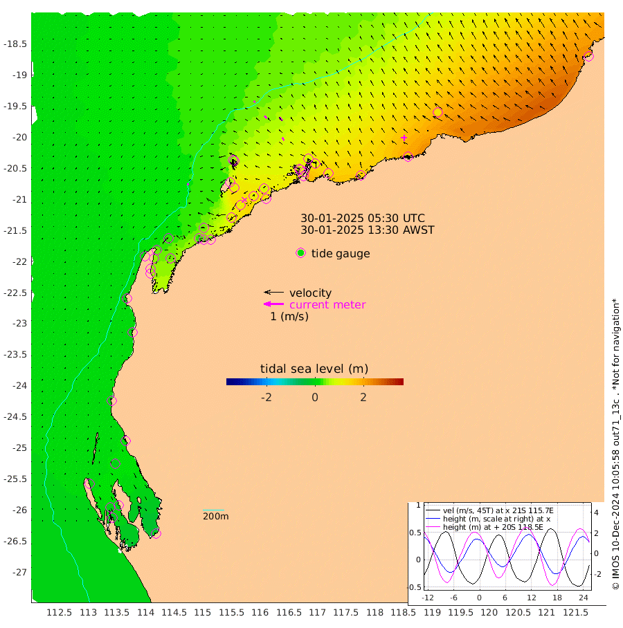 8cm/s -97T +12cm/s rms + 5cm/s -173T. NWSBAR 206m 2cm/s -130T +22cm/s rms + 10cm/s -148T. TAN100 109m 9cm/s -73T +11cm/s rms + 8cm/s -129T. PIL200 208m 15cm/s -48T +13cm/s rms + 7cm/s -137T. PIL100 105m 17cm/s -39T +12cm/s rms + 2cm/s -92T. PIL050 55m 1cm/s -99T +18cm/s rms + 4cm/s -149T. NRSNIN 61m 22cm/s -43T +6cm/s rms + 3cm/s 112T. NW Shelf M6 65m 7cm Withnell Point -1cm Denham -4cm Shark Bay (Inr Bn) -5cm Shark Bay -16cm Useless Loop -19cm Hamelin Pool 21cm Carnarvon 8cm Cape Cuvier 8cm Coral Bay 11cm Norwegian Bay 56cm Badjirrajirra 14cm Tantabiddi 36cm Point Murat 48cm Exmouth 62cm Learmonth 39cm Y Island 24cm North Muiron Island 31cm Roller 36cm Ashburton North 42cm Onslow (Beadon Creek) 37cm Thevenard Island 113cm Large Island 112cm North Sandy Island 65cm Barrow Island (Wapet Landing) 104cm Barrow Island (Tanker Mooring) 90cm Withnell Bay 67cm Trimouille Island 45cm North West Island 128cm Fortescue Road 88cm Steamboat Island 105cm Sholl Island 90cm Fairway Beacon 90cm Mawby Island 91cm Dampier (King Bay) 85cm Cape Legendre 111cm Hauy Island 123cm Port Walcott (Cape Lambert) 151cm Depuch Island 153cm Port Hedland 127cm Bedout Island 178cm Lagrange Bay