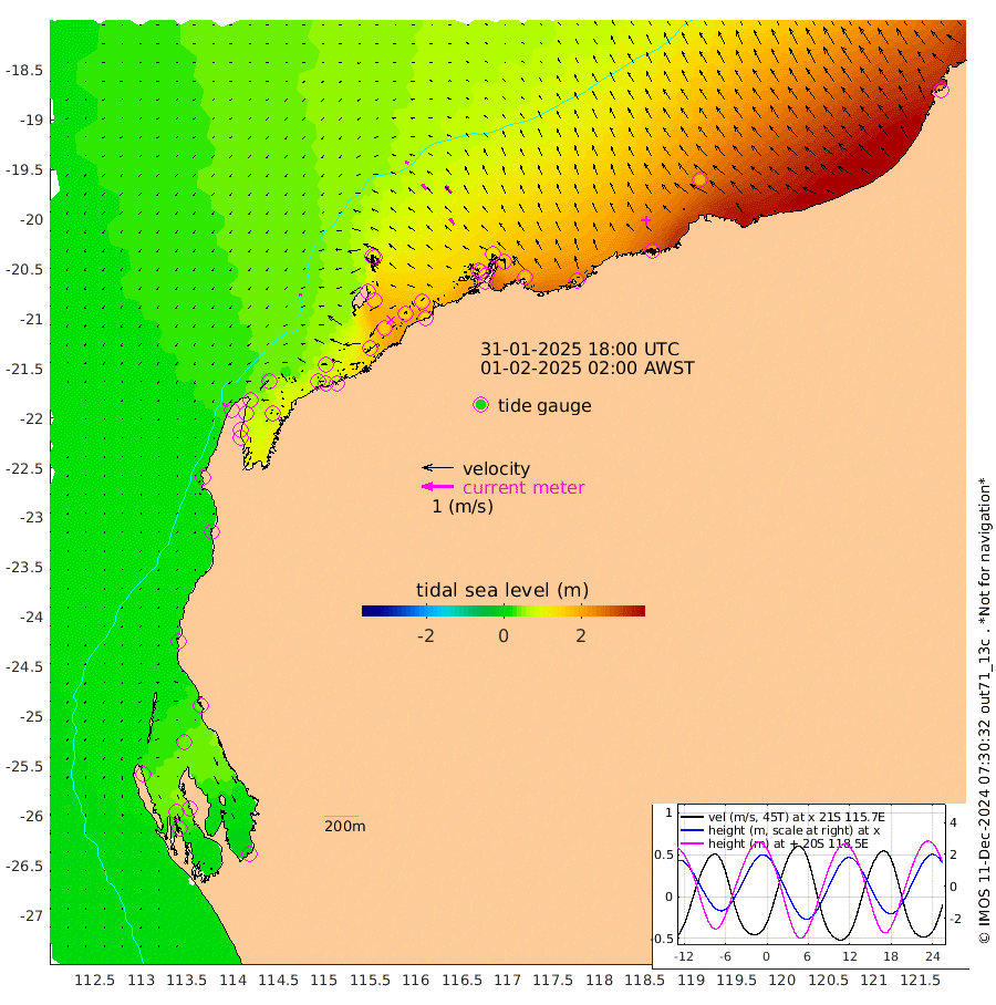 9cm/s -88T +12cm/s rms + 5cm/s -173T. NWSBAR 206m 8cm/s -137T +22cm/s rms + 10cm/s -148T. TAN100 109m 11cm/s -66T +11cm/s rms + 8cm/s -129T. PIL200 208m 20cm/s -46T +13cm/s rms + 7cm/s -137T. PIL100 105m 24cm/s -39T +12cm/s rms + 2cm/s -92T. PIL050 55m 8cm/s -131T +18cm/s rms + 4cm/s -149T. NRSNIN 61m 30cm/s -39T +6cm/s rms + 3cm/s 112T. NW Shelf M6 65m 35cm Withnell Point 43cm Denham 40cm Shark Bay (Inr Bn) 42cm Shark Bay 34cm Useless Loop -7cm Hamelin Pool 40cm Carnarvon 18cm Cape Cuvier 19cm Coral Bay 22cm Norwegian Bay 91cm Badjirrajirra 29cm Tantabiddi 62cm Point Murat 80cm Exmouth 93cm Learmonth 70cm Y Island 46cm North Muiron Island 57cm Roller 59cm Ashburton North 70cm Onslow (Beadon Creek) 63cm Thevenard Island 127cm Large Island 150cm North Sandy Island 100cm Barrow Island (Wapet Landing) 152cm Barrow Island (Tanker Mooring) 134cm Withnell Bay 93cm Trimouille Island 79cm North West Island 139cm Fortescue Road 140cm Steamboat Island 149cm Sholl Island 133cm Fairway Beacon 133cm Mawby Island 134cm Dampier (King Bay) 127cm Cape Legendre 161cm Hauy Island 176cm Port Walcott (Cape Lambert) 206cm Depuch Island 217cm Port Hedland 191cm Bedout Island 204cm Lagrange Bay
