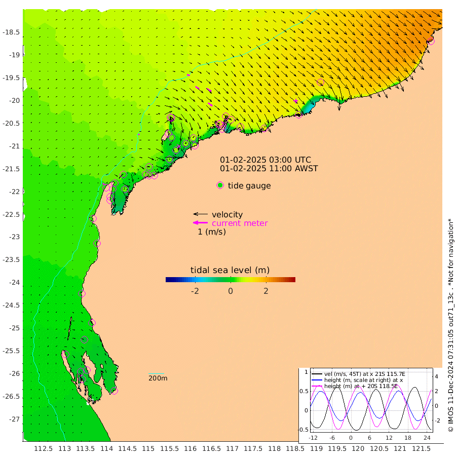 9cm/s 49T +12cm/s rms + 5cm/s -173T. NWSBAR 206m 11cm/s 43T +22cm/s rms + 10cm/s -148T. TAN100 109m 19cm/s 109T +11cm/s rms + 8cm/s -129T. PIL200 208m 32cm/s 124T +13cm/s rms + 7cm/s -137T. PIL100 105m 38cm/s 127T +12cm/s rms + 2cm/s -92T. PIL050 55m 11cm/s 47T +18cm/s rms + 4cm/s -149T. NRSNIN 61m 38cm/s 124T +6cm/s rms + 3cm/s 112T. NW Shelf M6 65m -9cm Withnell Point -33cm Denham -29cm Shark Bay (Inr Bn) -33cm Shark Bay -36cm Useless Loop -7cm Hamelin Pool 9cm Carnarvon 21cm Cape Cuvier 25cm Coral Bay 27cm Norwegian Bay 28cm Badjirrajirra 29cm Tantabiddi 25cm Point Murat 25cm Exmouth 33cm Learmonth 36cm Y Island 32cm North Muiron Island 39cm Roller 43cm Ashburton North 43cm Onslow (Beadon Creek) 44cm Thevenard Island 44cm Large Island 47cm North Sandy Island 53cm Barrow Island (Wapet Landing) 40cm Barrow Island (Tanker Mooring) 93cm Withnell Bay 57cm Trimouille Island 44cm North West Island 63cm Fortescue Road 79cm Steamboat Island 56cm Sholl Island 88cm Fairway Beacon 92cm Mawby Island 92cm Dampier (King Bay) 100cm Cape Legendre 85cm Hauy Island 106cm Port Walcott (Cape Lambert) 114cm Depuch Island 138cm Port Hedland 155cm Bedout Island 287cm Lagrange Bay