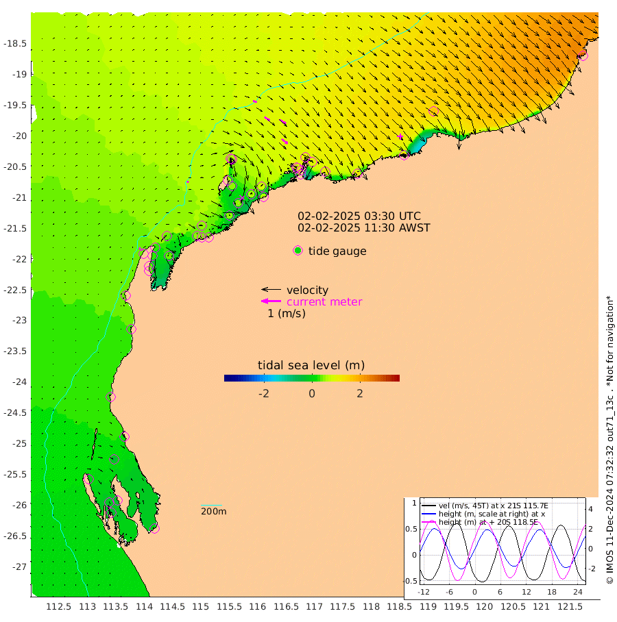9cm/s 54T +12cm/s rms + 5cm/s -173T. NWSBAR 206m 11cm/s 42T +22cm/s rms + 10cm/s -148T. TAN100 109m 20cm/s 109T +11cm/s rms + 8cm/s -129T. PIL200 208m 33cm/s 124T +13cm/s rms + 7cm/s -137T. PIL100 105m 39cm/s 126T +12cm/s rms + 2cm/s -92T. PIL050 55m 11cm/s 47T +18cm/s rms + 4cm/s -149T. NRSNIN 61m 38cm/s 123T +6cm/s rms + 3cm/s 112T. NW Shelf M6 65m -1cm Withnell Point -24cm Denham -20cm Shark Bay (Inr Bn) -25cm Shark Bay -27cm Useless Loop -7cm Hamelin Pool 17cm Carnarvon 29cm Cape Cuvier 33cm Coral Bay 34cm Norwegian Bay 36cm Badjirrajirra 36cm Tantabiddi 33cm Point Murat 33cm Exmouth 40cm Learmonth 43cm Y Island 40cm North Muiron Island 46cm Roller 51cm Ashburton North 51cm Onslow (Beadon Creek) 52cm Thevenard Island 50cm Large Island 54cm North Sandy Island 61cm Barrow Island (Wapet Landing) 47cm Barrow Island (Tanker Mooring) 101cm Withnell Bay 65cm Trimouille Island 53cm North West Island 64cm Fortescue Road 90cm Steamboat Island 63cm Sholl Island 96cm Fairway Beacon 100cm Mawby Island 100cm Dampier (King Bay) 107cm Cape Legendre 91cm Hauy Island 114cm Port Walcott (Cape Lambert) 122cm Depuch Island 146cm Port Hedland 163cm Bedout Island 276cm Lagrange Bay