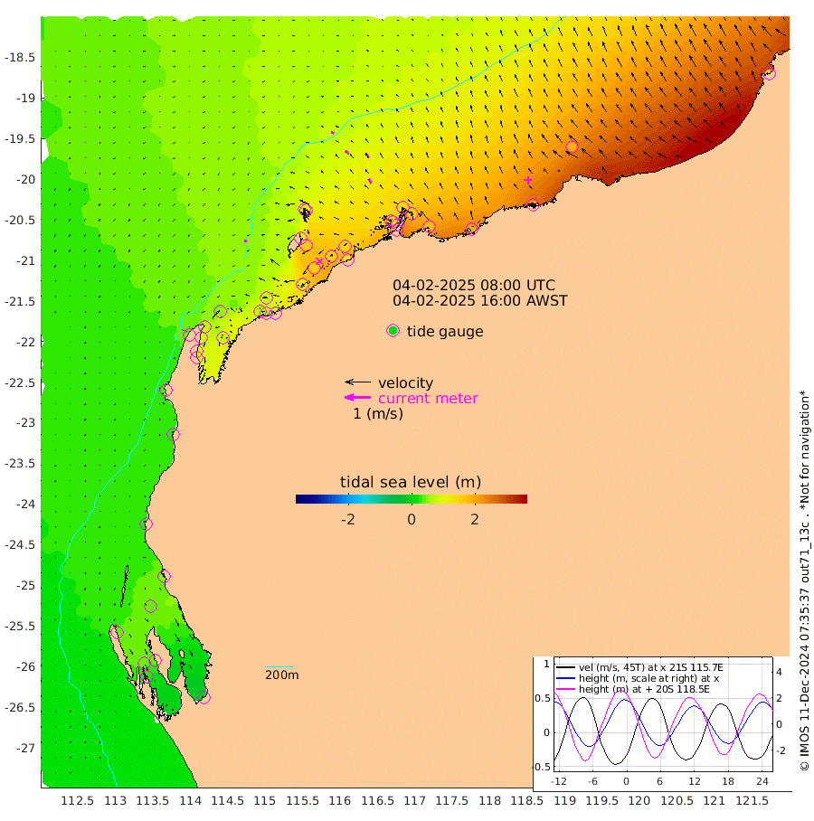 9cm/s -92T +12cm/s rms + 5cm/s -173T. NWSBAR 206m 4cm/s -137T +22cm/s rms + 10cm/s -148T. TAN100 109m 10cm/s -67T +11cm/s rms + 8cm/s -129T. PIL200 208m 18cm/s -40T +13cm/s rms + 7cm/s -137T. PIL100 105m 21cm/s -32T +12cm/s rms + 2cm/s -92T. PIL050 55m 4cm/s -125T +18cm/s rms + 4cm/s -149T. NRSNIN 61m 22cm/s -37T +6cm/s rms + 3cm/s 112T. NW Shelf M6 65m 36cm Withnell Point 38cm Denham 35cm Shark Bay (Inr Bn) 34cm Shark Bay 27cm Useless Loop -13cm Hamelin Pool 50cm Carnarvon 29cm Cape Cuvier 30cm Coral Bay 37cm Norwegian Bay 98cm Badjirrajirra 38cm Tantabiddi 69cm Point Murat 86cm Exmouth 95cm Learmonth 76cm Y Island 53cm North Muiron Island 62cm Roller 67cm Ashburton North 77cm Onslow (Beadon Creek) 69cm Thevenard Island 107cm Large Island 149cm North Sandy Island 105cm Barrow Island (Wapet Landing) 149cm Barrow Island (Tanker Mooring) 135cm Withnell Bay 105cm Trimouille Island 75cm North West Island 121cm Fortescue Road 138cm Steamboat Island 152cm Sholl Island 133cm Fairway Beacon 131cm Mawby Island 134cm Dampier (King Bay) 138cm Cape Legendre 156cm Hauy Island 172cm Port Walcott (Cape Lambert) 191cm Depuch Island 208cm Port Hedland 182cm Bedout Island 155cm Lagrange Bay