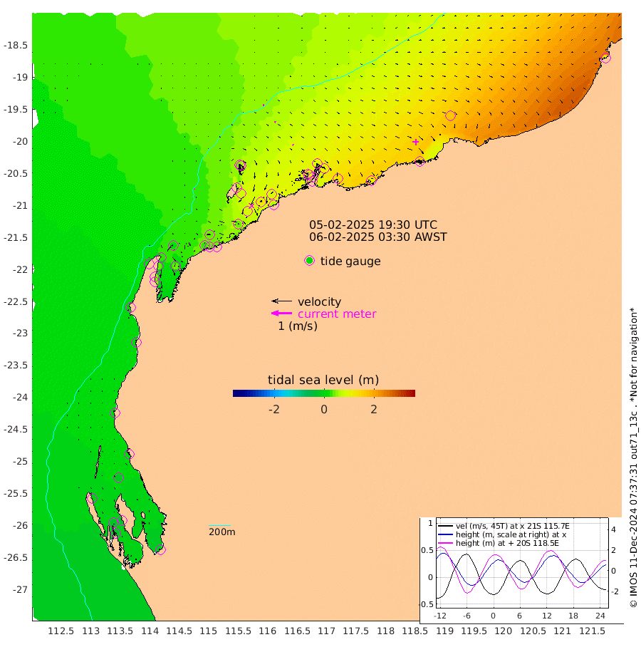 5cm/s 6T +12cm/s rms + 5cm/s -173T. NWSBAR 206m 1cm/s 104T +22cm/s rms + 10cm/s -148T. TAN100 109m 5cm/s 97T +11cm/s rms + 8cm/s -129T. PIL200 208m 6cm/s 117T +13cm/s rms + 7cm/s -137T. PIL100 105m 5cm/s 112T +12cm/s rms + 2cm/s -92T. PIL050 55m 1cm/s 90T +18cm/s rms + 4cm/s -149T. NRSNIN 61m 1cm/s 73T +6cm/s rms + 3cm/s 112T. NW Shelf M6 65m -11cm Withnell Point -24cm Denham -24cm Shark Bay (Inr Bn) -21cm Shark Bay -29cm Useless Loop -7cm Hamelin Pool 4cm Carnarvon 3cm Cape Cuvier 5cm Coral Bay 9cm Norwegian Bay 46cm Badjirrajirra 12cm Tantabiddi 28cm Point Murat 37cm Exmouth 46cm Learmonth 37cm Y Island 22cm North Muiron Island 31cm Roller 35cm Ashburton North 39cm Onslow (Beadon Creek) 37cm Thevenard Island 41cm Large Island 84cm North Sandy Island 61cm Barrow Island (Wapet Landing) 81cm Barrow Island (Tanker Mooring) 96cm Withnell Bay 58cm Trimouille Island 42cm North West Island 57cm Fortescue Road 90cm Steamboat Island 113cm Sholl Island 94cm Fairway Beacon 96cm Mawby Island 96cm Dampier (King Bay) 94cm Cape Legendre 107cm Hauy Island 124cm Port Walcott (Cape Lambert) 122cm Depuch Island 160cm Port Hedland 162cm Bedout Island 132cm Lagrange Bay