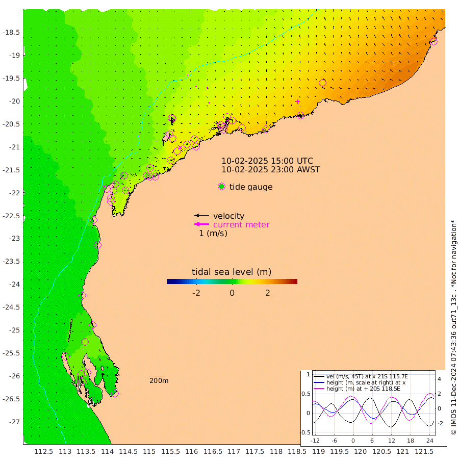 3cm/s -94T +12cm/s rms + 5cm/s -173T. NWSBAR 206m 3cm/s -130T +22cm/s rms + 10cm/s -148T. TAN100 109m 4cm/s -72T +11cm/s rms + 8cm/s -129T. PIL200 208m 8cm/s -38T +13cm/s rms + 7cm/s -137T. PIL100 105m 9cm/s -24T +12cm/s rms + 2cm/s -92T. PIL050 55m 4cm/s -127T +18cm/s rms + 4cm/s -149T. NRSNIN 61m 14cm/s -30T +6cm/s rms + 3cm/s 112T. NW Shelf M6 65m 36cm Withnell Point 46cm Denham 45cm Shark Bay (Inr Bn) 46cm Shark Bay 45cm Useless Loop 2cm Hamelin Pool 37cm Carnarvon 21cm Cape Cuvier 23cm Coral Bay 22cm Norwegian Bay 66cm Badjirrajirra 28cm Tantabiddi 48cm Point Murat 58cm Exmouth 66cm Learmonth 51cm Y Island 38cm North Muiron Island 43cm Roller 48cm Ashburton North 55cm Onslow (Beadon Creek) 51cm Thevenard Island 78cm Large Island 94cm North Sandy Island 73cm Barrow Island (Wapet Landing) 100cm Barrow Island (Tanker Mooring) 96cm Withnell Bay 65cm Trimouille Island 61cm North West Island 89cm Fortescue Road 94cm Steamboat Island 82cm Sholl Island 96cm Fairway Beacon 97cm Mawby Island 97cm Dampier (King Bay) 100cm Cape Legendre 107cm Hauy Island 122cm Port Walcott (Cape Lambert) 136cm Depuch Island 148cm Port Hedland 139cm Bedout Island 161cm Lagrange Bay