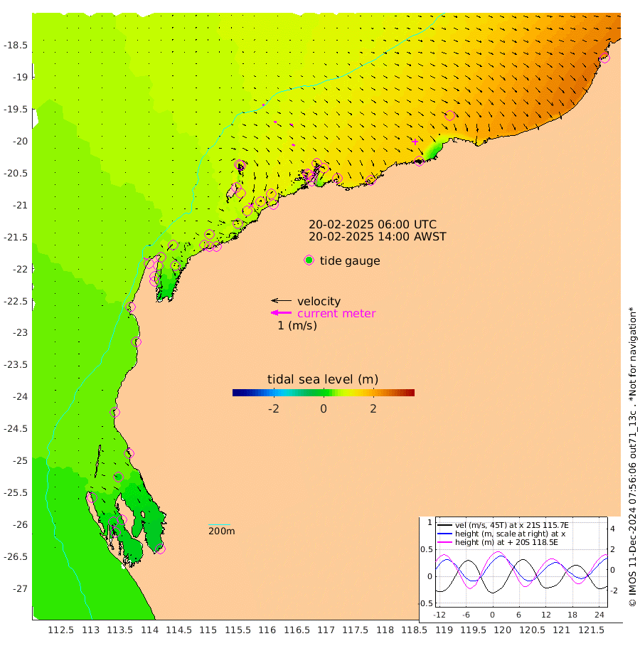 2cm/s 21T +12cm/s rms + 5cm/s -173T. NWSBAR 206m 6cm/s 38T +22cm/s rms + 10cm/s -148T. TAN100 109m 7cm/s 101T +11cm/s rms + 8cm/s -129T. PIL200 208m 12cm/s 116T +13cm/s rms + 7cm/s -137T. PIL100 105m 14cm/s 115T +12cm/s rms + 2cm/s -92T. PIL050 55m 6cm/s 44T +18cm/s rms + 4cm/s -149T. NRSNIN 61m 14cm/s 111T +6cm/s rms + 3cm/s 112T. NW Shelf M6 65m 31cm Withnell Point 19cm Denham 19cm Shark Bay (Inr Bn) 19cm Shark Bay 10cm Useless Loop -13cm Hamelin Pool 48cm Carnarvon 45cm Cape Cuvier 48cm Coral Bay 49cm Norwegian Bay 76cm Badjirrajirra 53cm Tantabiddi 63cm Point Murat 70cm Exmouth 76cm Learmonth 74cm Y Island 62cm North Muiron Island 71cm Roller 72cm Ashburton North 75cm Onslow (Beadon Creek) 74cm Thevenard Island 85cm Large Island 113cm North Sandy Island 92cm Barrow Island (Wapet Landing) 103cm Barrow Island (Tanker Mooring) 126cm Withnell Bay 95cm Trimouille Island 77cm North West Island 87cm Fortescue Road 124cm Steamboat Island 116cm Sholl Island 122cm Fairway Beacon 124cm Mawby Island 125cm Dampier (King Bay) 124cm Cape Legendre 126cm Hauy Island 147cm Port Walcott (Cape Lambert) 165cm Depuch Island 178cm Port Hedland 177cm Bedout Island 206cm Lagrange Bay