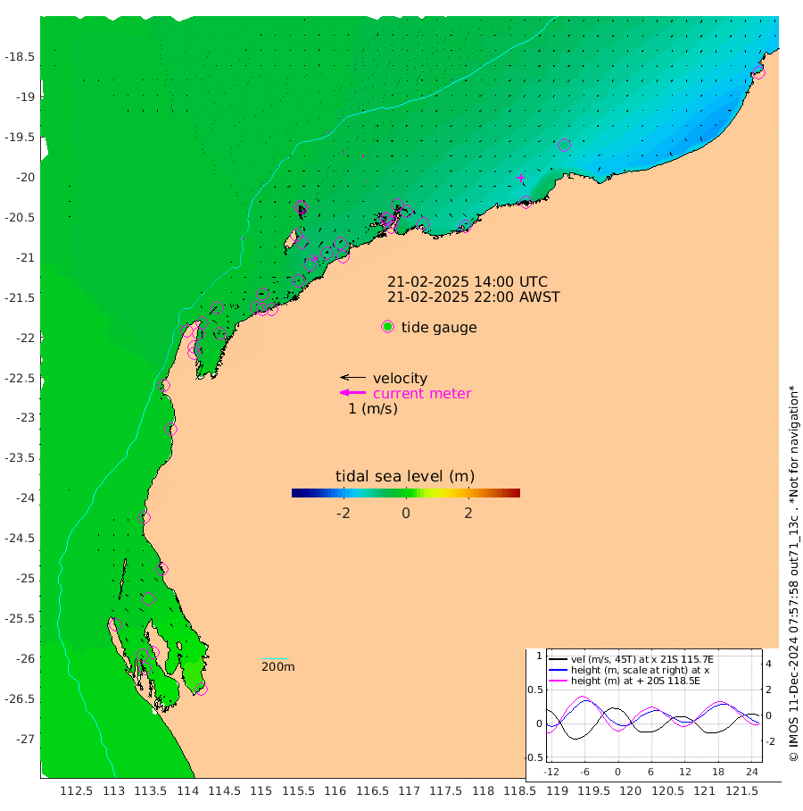 3cm/s 124T +12cm/s rms + 5cm/s -173T. NWSBAR 206m 2cm/s -129T +22cm/s rms + 10cm/s -148T. TAN100 109m 2cm/s -100T +11cm/s rms + 8cm/s -129T. PIL200 208m 2cm/s -90T +13cm/s rms + 7cm/s -137T. PIL100 105m 3cm/s -111T +12cm/s rms + 2cm/s -92T. PIL050 55m 3cm/s -136T +18cm/s rms + 4cm/s -149T. NRSNIN 61m 6cm/s -85T +6cm/s rms + 3cm/s 112T. NW Shelf M6 65m -11cm Withnell Point 6cm Denham 9cm Shark Bay (Inr Bn) 7cm Shark Bay 20cm Useless Loop 20cm Hamelin Pool -27cm Carnarvon -23cm Cape Cuvier -24cm Coral Bay -28cm Norwegian Bay -49cm Badjirrajirra -28cm Tantabiddi -38cm Point Murat -44cm Exmouth -49cm Learmonth -45cm Y Island -35cm North Muiron Island -42cm Roller -40cm Ashburton North -44cm Onslow (Beadon Creek) -42cm Thevenard Island -59cm Large Island -78cm North Sandy Island -56cm Barrow Island (Wapet Landing) -72cm Barrow Island (Tanker Mooring) -76cm Withnell Bay -58cm Trimouille Island -45cm North West Island -63cm Fortescue Road -82cm Steamboat Island -87cm Sholl Island -75cm Fairway Beacon -76cm Mawby Island -75cm Dampier (King Bay) -75cm Cape Legendre -87cm Hauy Island -92cm Port Walcott (Cape Lambert) -105cm Depuch Island -111cm Port Hedland -92cm Bedout Island -129cm Lagrange Bay