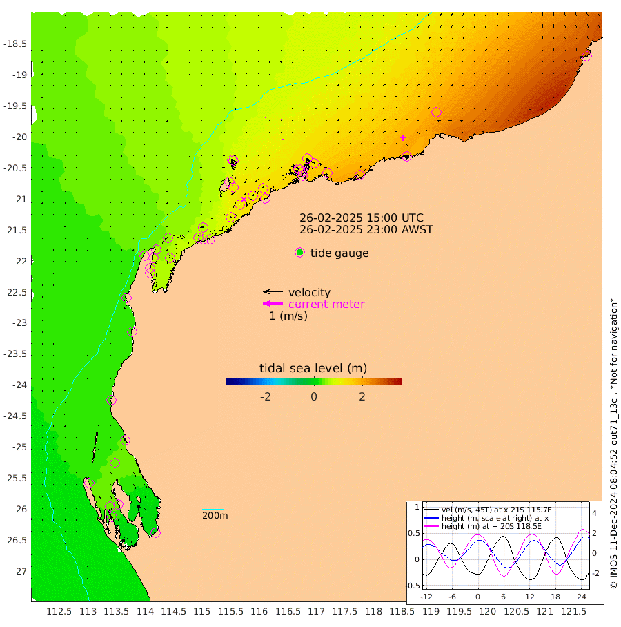 3cm/s -67T +12cm/s rms + 5cm/s -173T. NWSBAR 206m 1cm/s -123T +22cm/s rms + 10cm/s -148T. TAN100 109m 1cm/s -36T +11cm/s rms + 8cm/s -129T. PIL200 208m 3cm/s -7T +13cm/s rms + 7cm/s -137T. PIL100 105m 5cm/s 19T +12cm/s rms + 2cm/s -92T. PIL050 55m 1cm/s -120T +18cm/s rms + 4cm/s -149T. NRSNIN 61m 8cm/s -7T +6cm/s rms + 3cm/s 112T. NW Shelf M6 65m 36cm Withnell Point 40cm Denham 38cm Shark Bay (Inr Bn) 41cm Shark Bay 36cm Useless Loop -4cm Hamelin Pool 42cm Carnarvon 28cm Cape Cuvier 30cm Coral Bay 31cm Norwegian Bay 76cm Badjirrajirra 38cm Tantabiddi 57cm Point Murat 68cm Exmouth 76cm Learmonth 66cm Y Island 50cm North Muiron Island 59cm Roller 62cm Ashburton North 68cm Onslow (Beadon Creek) 65cm Thevenard Island 109cm Large Island 118cm North Sandy Island 91cm Barrow Island (Wapet Landing) 119cm Barrow Island (Tanker Mooring) 125cm Withnell Bay 83cm Trimouille Island 77cm North West Island 126cm Fortescue Road 123cm Steamboat Island 106cm Sholl Island 122cm Fairway Beacon 123cm Mawby Island 125cm Dampier (King Bay) 121cm Cape Legendre 138cm Hauy Island 156cm Port Walcott (Cape Lambert) 186cm Depuch Island 191cm Port Hedland 185cm Bedout Island 272cm Lagrange Bay