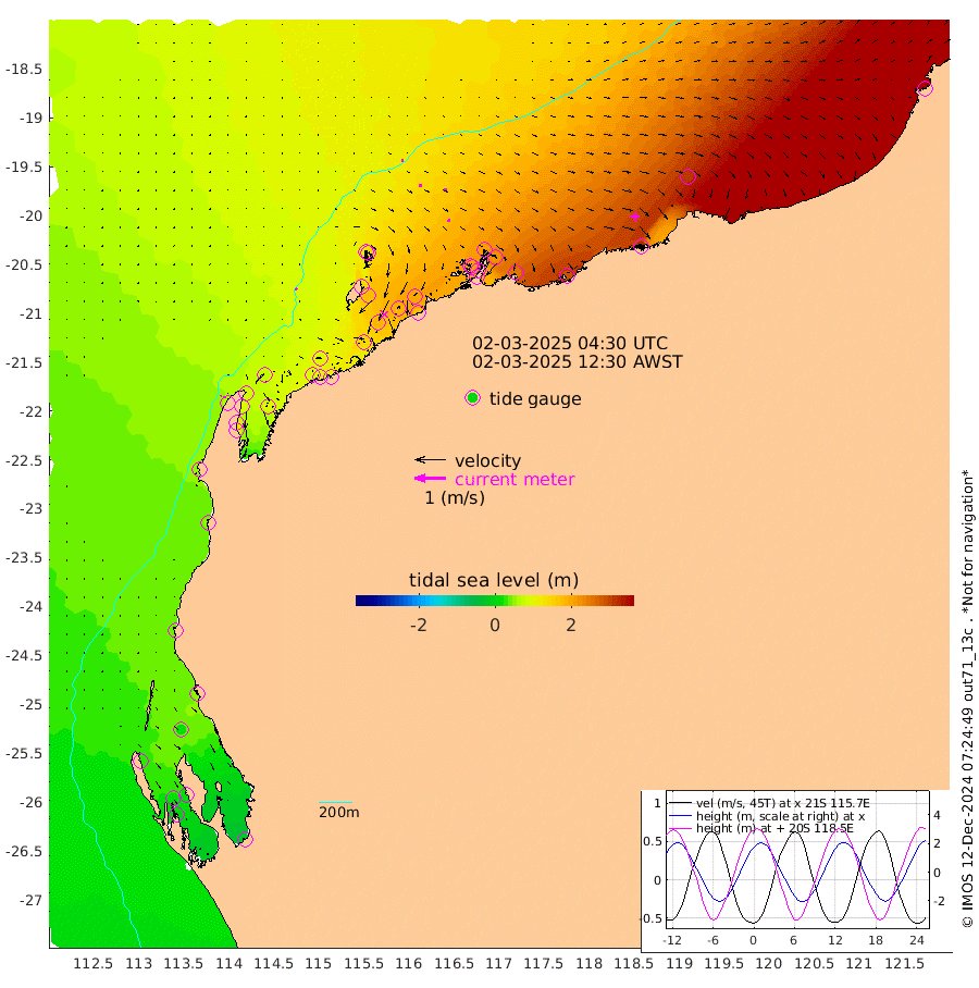5cm/s -50T +12cm/s rms + 5cm/s -173T. NWSBAR 206m 4cm/s 41T +22cm/s rms + 10cm/s -148T. TAN100 109m 4cm/s 99T +11cm/s rms + 8cm/s -129T. PIL200 208m 7cm/s 92T +13cm/s rms + 7cm/s -137T. PIL100 105m 9cm/s 86T +12cm/s rms + 2cm/s -92T. PIL050 55m 4cm/s 41T +18cm/s rms + 4cm/s -149T. NRSNIN 61m 10cm/s 80T +6cm/s rms + 3cm/s 112T. NW Shelf M6 65m 28cm Withnell Point 14cm Denham 13cm Shark Bay (Inr Bn) 12cm Shark Bay 0cm Useless Loop -17cm Hamelin Pool 53cm Carnarvon 41cm Cape Cuvier 45cm Coral Bay 49cm Norwegian Bay 114cm Badjirrajirra 56cm Tantabiddi 84cm Point Murat 101cm Exmouth 117cm Learmonth 99cm Y Island 75cm North Muiron Island 89cm Roller 97cm Ashburton North 106cm Onslow (Beadon Creek) 100cm Thevenard Island 146cm Large Island 188cm North Sandy Island 143cm Barrow Island (Wapet Landing) 180cm Barrow Island (Tanker Mooring) 206cm Withnell Bay 143cm Trimouille Island 111cm North West Island 173cm Fortescue Road 200cm Steamboat Island 191cm Sholl Island 201cm Fairway Beacon 202cm Mawby Island 205cm Dampier (King Bay) 208cm Cape Legendre 223cm Hauy Island 256cm Port Walcott (Cape Lambert) 290cm Depuch Island 319cm Port Hedland 311cm Bedout Island 387cm Lagrange Bay